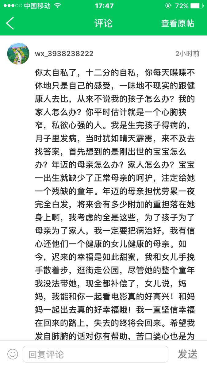今天终于没看到这污染空气的帖子了。我觉得她特别自私,最爱的是就是自己,没想着孝顺父母,抚养孩子。她一点也没意识到她整天都这样给她老公孩子带来了什么。有这样的妈妈,孩子好可怜。整天都叫心死了,要死了,日子没办法过了,痛苦…😂你还能说点别的么?整天加别人聊天,让人听她心死啦,要死啦,痛苦啊,病毁了她的生活。🌚妈的,好想一巴掌啪过去…算了,静静看着她装逼吧