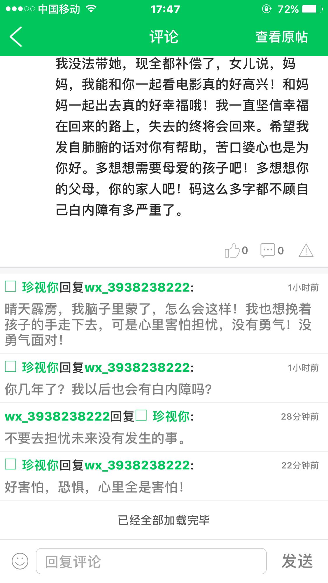 心理不健康的人真恐怖 。还有的是一个天天把死挂在嘴边上的人是不会去死的 !!! 30岁刚确诊几个月相对比于我们这些16岁就确诊甚至年龄更小的人 她是不是幸运得多了。还有我们比起那些癌症患者 白血病患者 等 这些 我们也是不是要她们幸运多了 。还有我自己 16岁那年确诊 ,今年第6个年头了 ,我右眼还是先天性弱视 ,左眼也近视 ,我也没有埋怨过谁 …虽然我也偶尔会悲观难过 ,但是更多的是 积极向上的生活 ,工作 ,虽然视力比不上正常人 很多工作我也无法胜任 ,但是我尽量让自己像个正常人一样活着 。爱自己 爱家人 爱这个世界 最后这句话 我很喜欢 :乐观地看待这个世界 。
