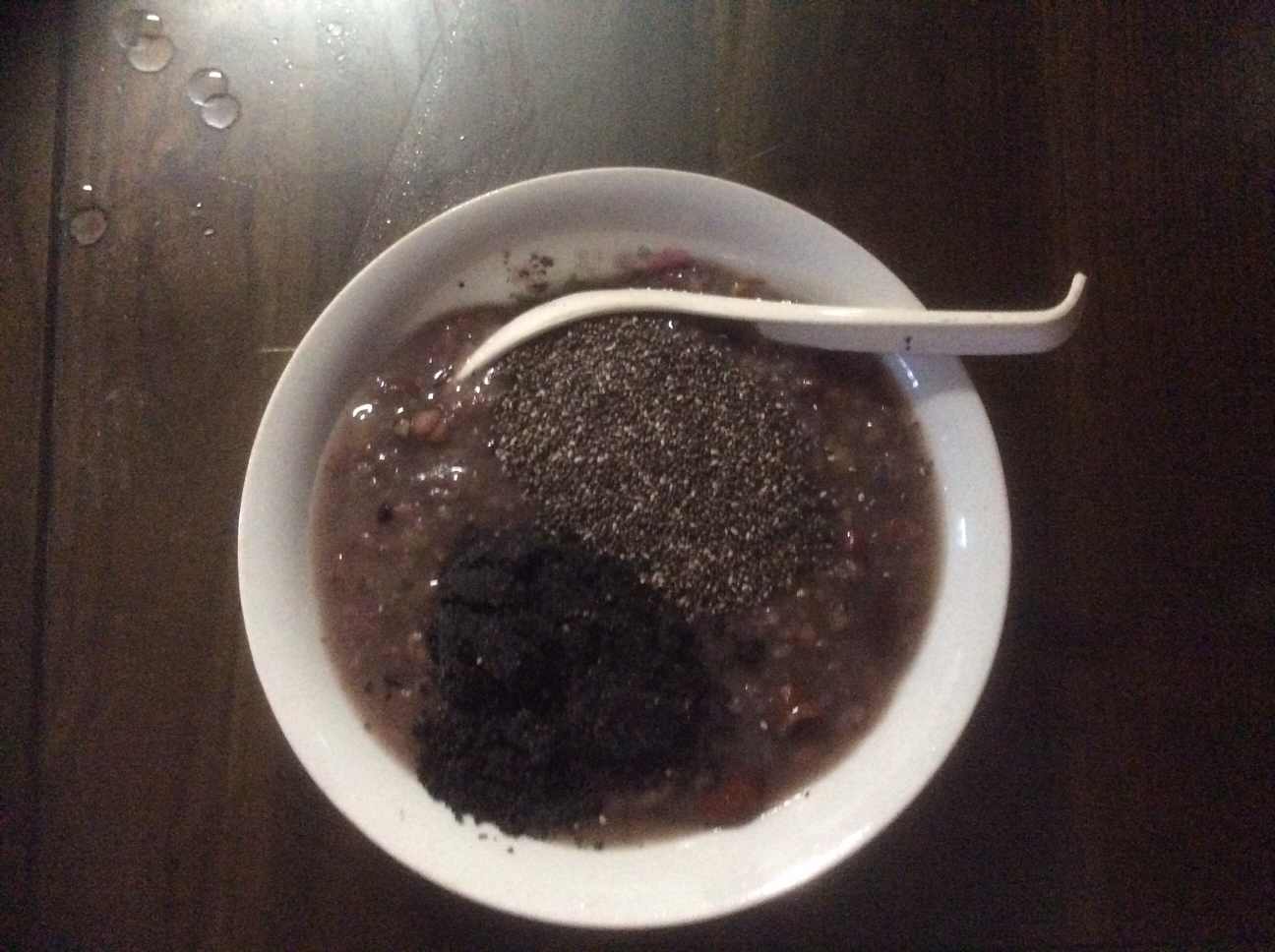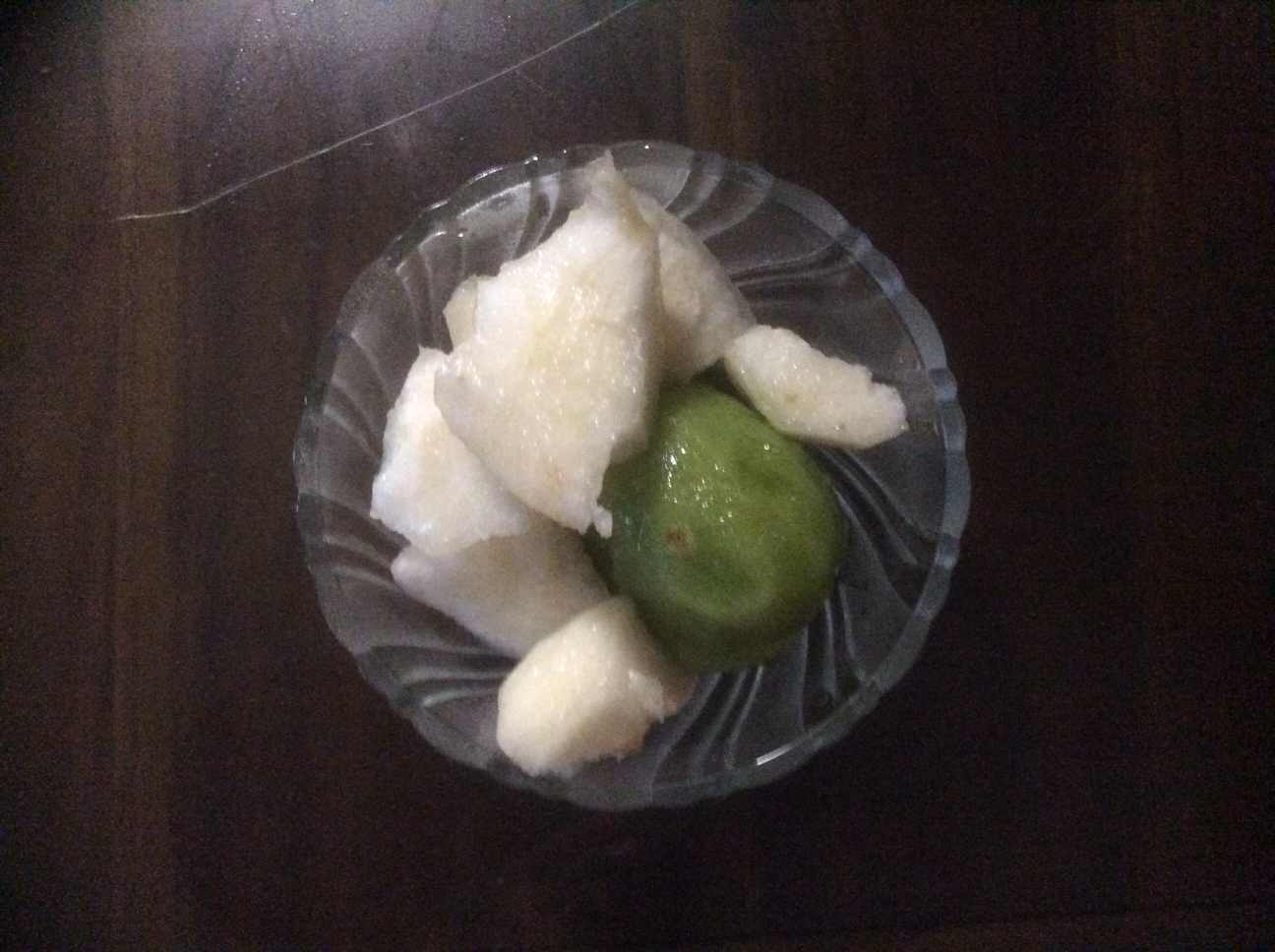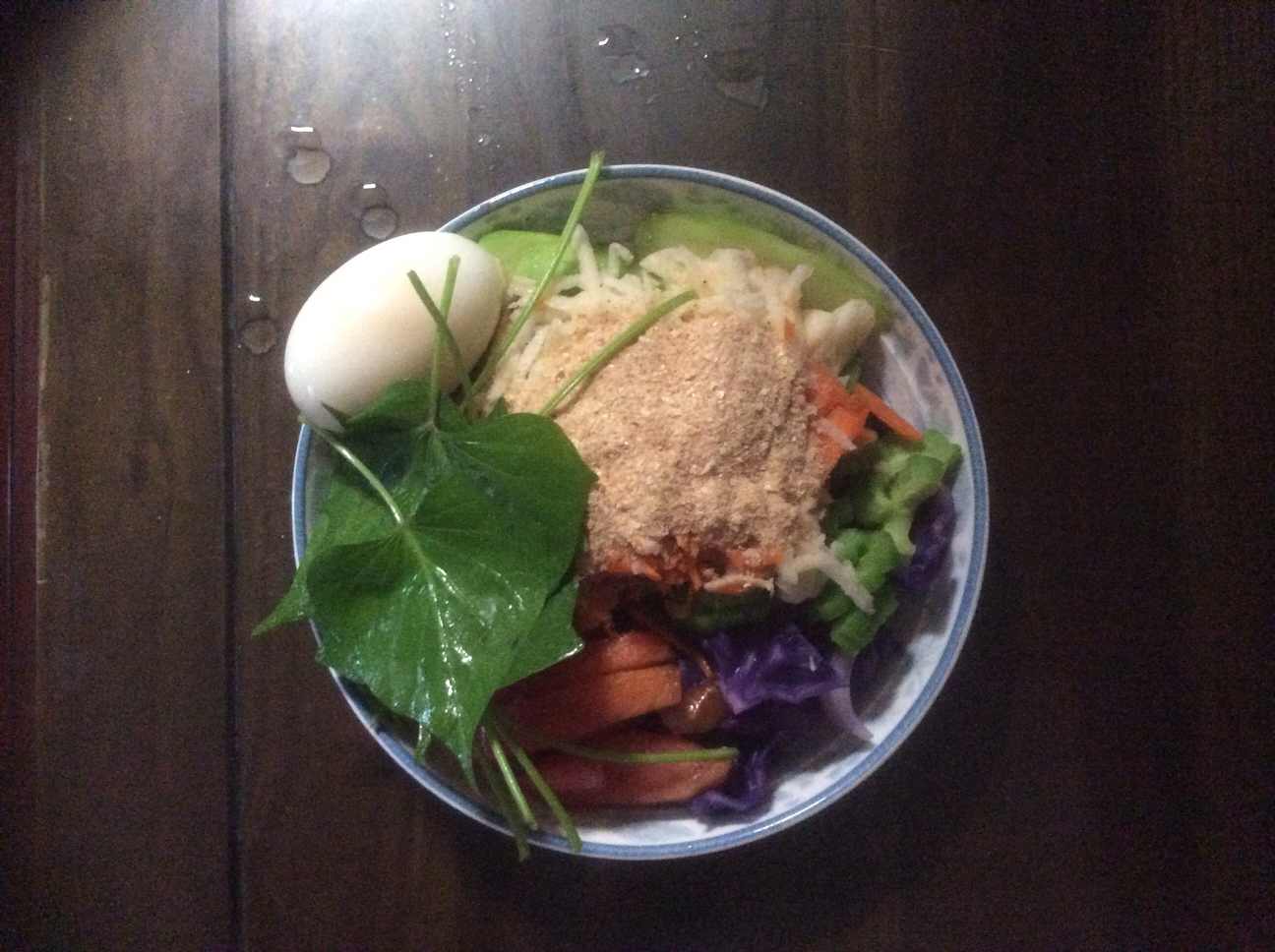 蔬菜一盘有:黄瓜、西红柿、苦瓜、洋葱、紫甘蓝、胡萝卜、藕、番薯叶、虾皮粉、熟鸭蛋一个;水果盘:猕猴桃、梨;柠檬水;杂粮粥:10种谷物加红枣、番薯、芝麻粉、奇亚籽。数量不多但品种很多,蔬菜用开水焯一下,味道好多了!