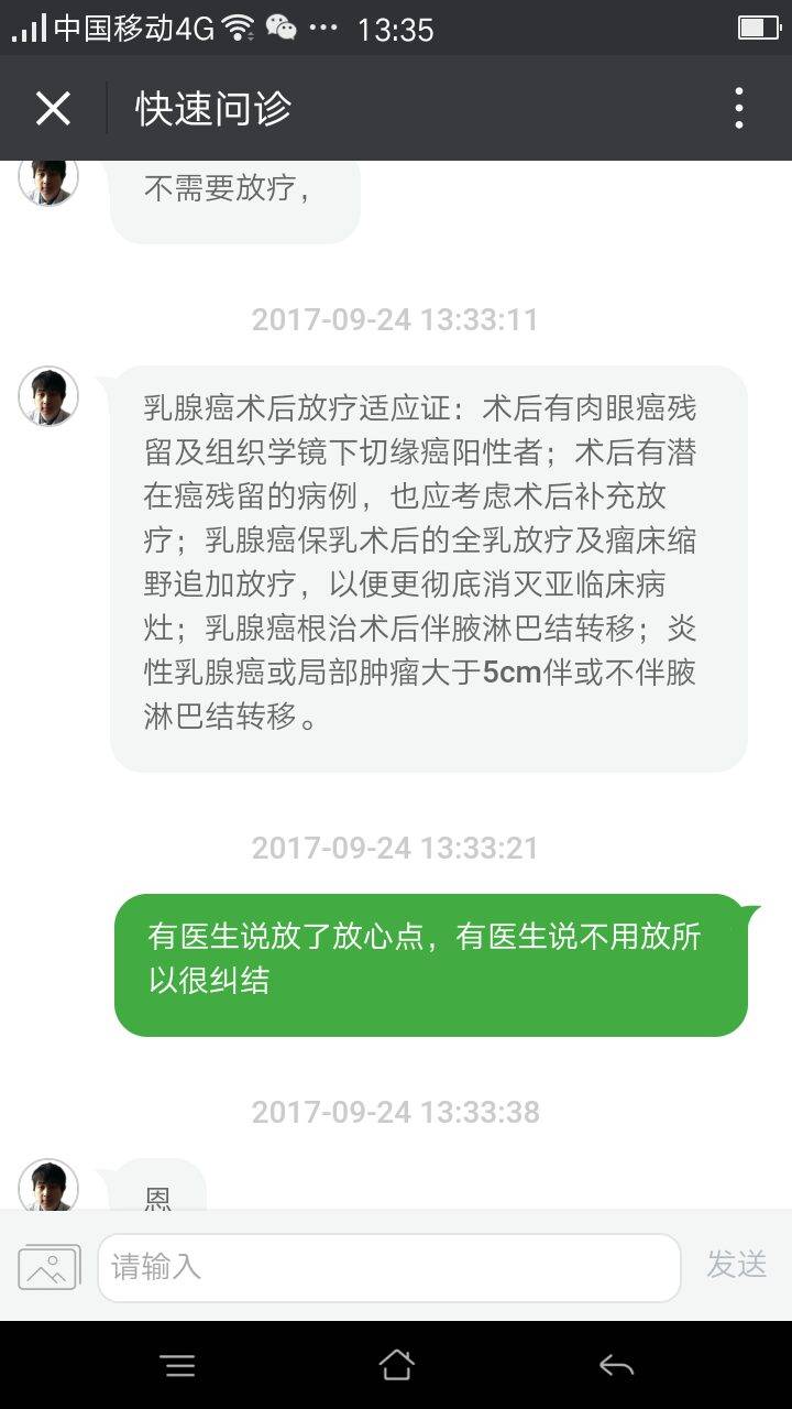 上次关于放疗的问题,开始主治医生说可放可不放,最后又说不放也可以,问觅健的众姐妹大部人建议放,今天在网上挂了五个教授号有三个说不用放,有二个建议放,越问越纠结了,倒不是在乎钱,自己本身是疤痕体脂怕破皮,又在省诚呆一个月,小孩没有人带!必竞也有副作用,不放吧,似乎不是那么放心,明天七疗了!该决定了!