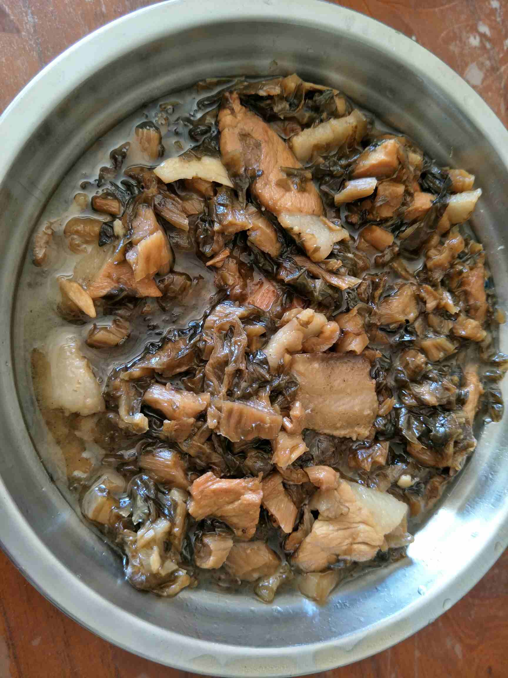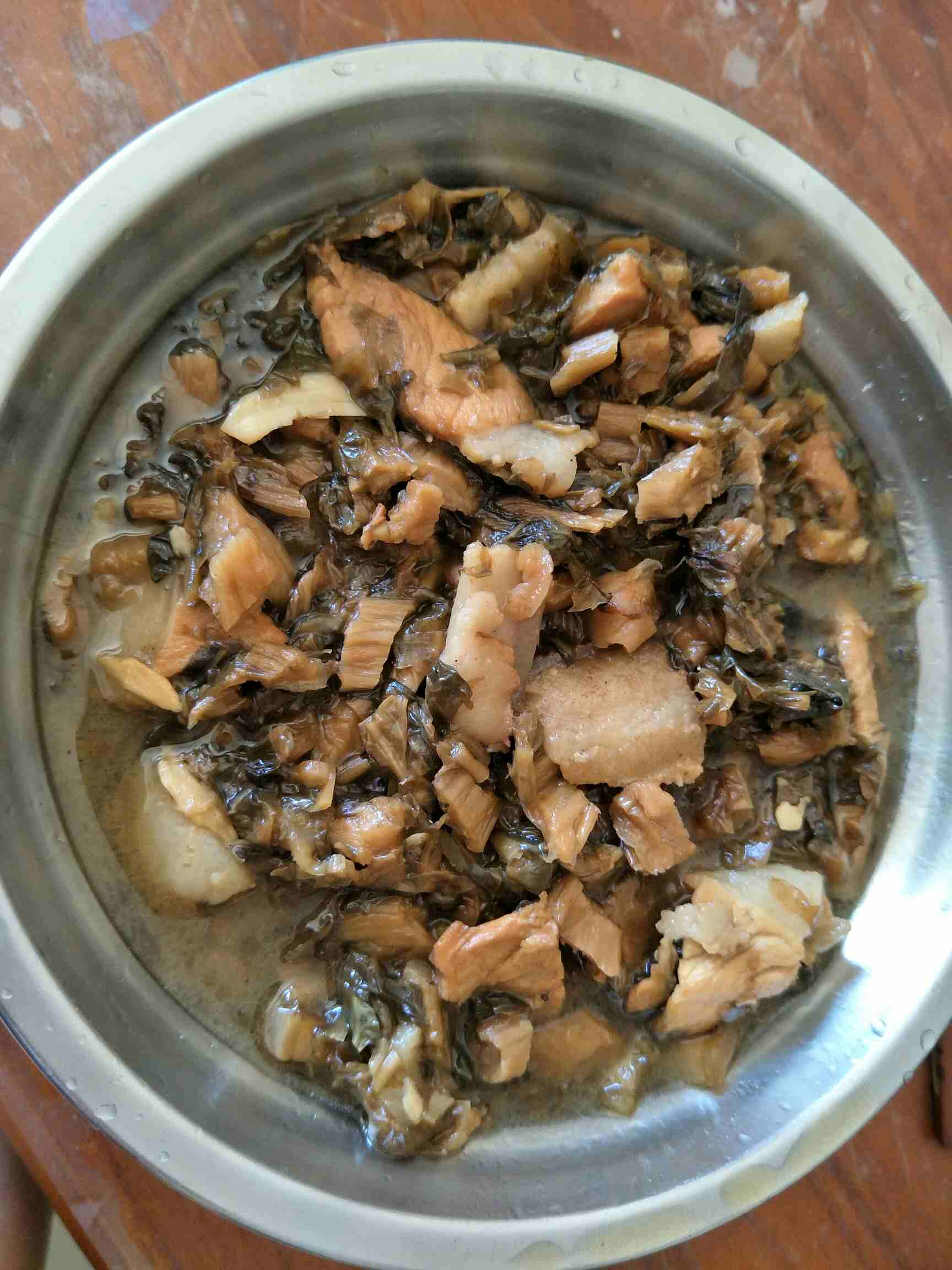 先把梅菜泡一泡,猪肉切片,烧红锅,爆一下,再放入梅菜,炒,然后加入水放入红糖,小火炆!!