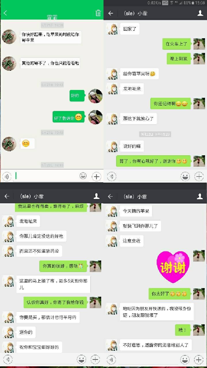 住院的时候,霏霏也一直有和我聊天,还经常鼓励我,说等我好了,就给我寄她家乡种的苹果给我吃!那时候是5月份说的,如今9月份了,她还记得她说过的话!