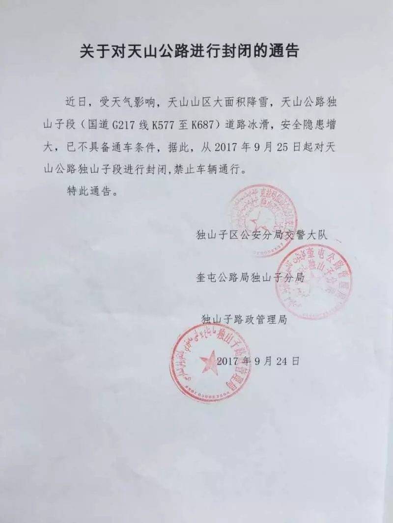 近日,受天气影响,天山山区大面积降雪,天山公路独山子段(国道G217线K577至K687)道路冰滑,安全隐患增大,不具备通车条件。为此,克拉玛依市公安局独山子区分局交警大队、奎屯公路局独山子分局、独山子路政管理局三家联合发出通告,自2017年9月25日0时起对天山公路独山子段进行封闭,禁止车辆通行。