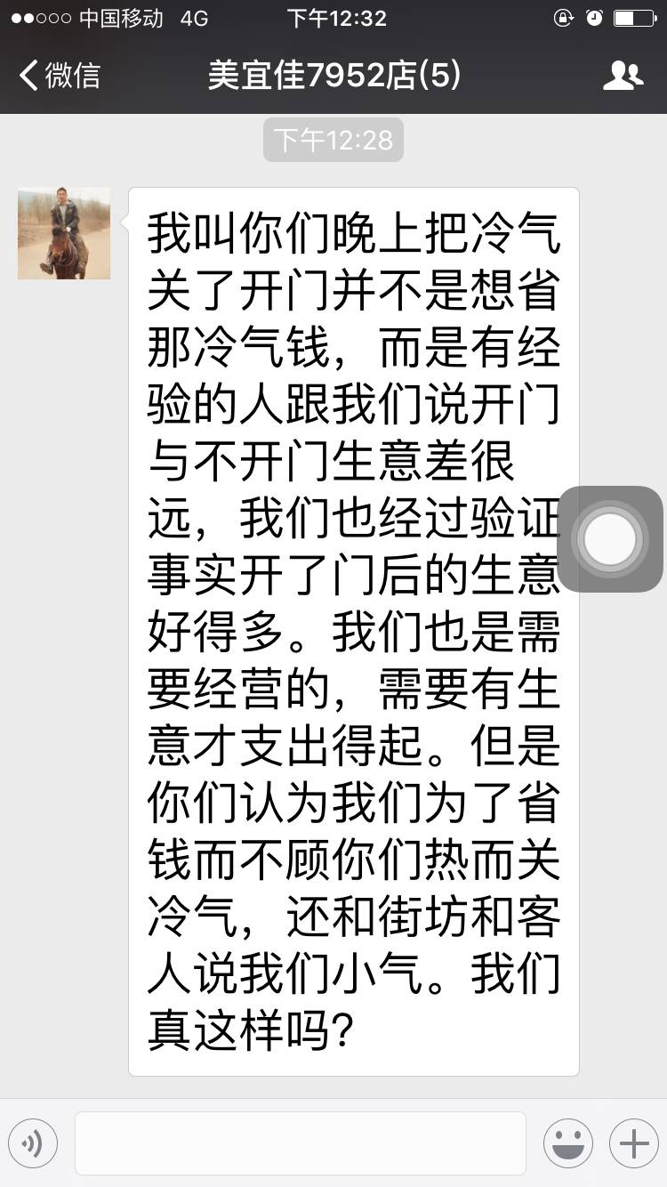 我们老板好奇怪 ,这个夏天我们上晚班的都没有空调开 ,早班,中班 都可以开 。他的理由是 晚上进来店买东西的客人比较多 ,关了空调 ,把门打开 生意会比较好。还有的是 ,晚上不是很热 ,不用开空调 。有时候有个别客人进来 就会问这么热 怎么不开空调 ,可能我也不知道自己什么时候嘴快 ,就说了 是老板晚上不让开空调 ,但是 我说的也是事实啊 ,确实是他说晚上不用开空调的 。还有的是 他在群里说没有指名道姓的 说谁 。我和另外一个轮流上夜班那个 ,我问她 她说跟她客人说过 是老板不让我们开空调的 。但是不知道怎么这话就到老板的耳里了 … 现在好烦 真的好烦 完全不想去上班了 ,辞工 又不知道如何开口 。哎 真烦啊 。
