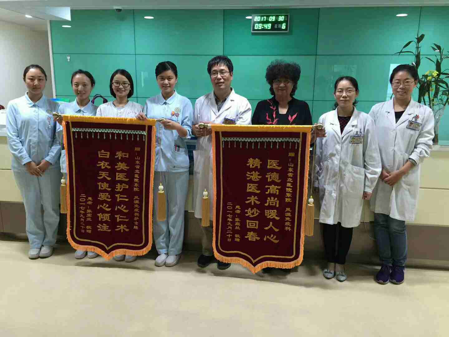 照片中的帅哥就是我们主治医生,山东省立医院的杨青锐主任,确诊结蒂组织病免疫性血小板减少两年一直就诊杨主任,他对每一个病人都态度和蔼,既考虑病人的经济情况,又关心病人的心理问题,遇到问题随时咨询,他都会耐心回答,这两年来,感觉杨主任就像家人一样陪伴着我们,正如这个病友送的锦旗所绣:医德高尚,医术精湛,仁心仁术!
