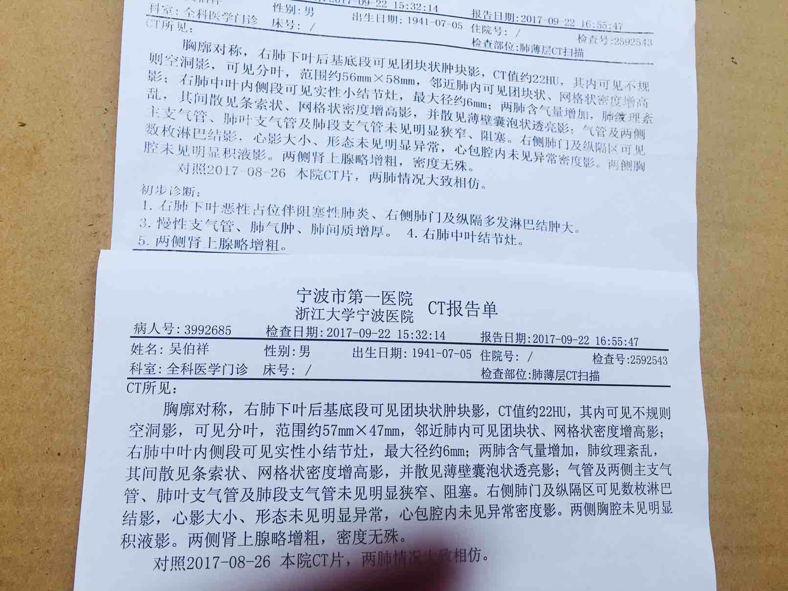 今日、加入觅健大家庭整整90天!感谢平台感谢所有为我们服务的工作人员!感恩有你们! 很多觅友期待着我家的成绩单、我怎可辜负你们? 先啰嗦一番、成绩单在下面哈 5月22日、因连续咳嗽痰浓十几天去医院检查、以肺炎收入呼吸科住院、每天挂消炎水治疗!5月27日增强C天报告出来,主任把我们家属叫进他的办公室,脸色深沉:右肺下叶占位,我:什么占位、占什么位?主任:考虑肺癌!瞬间、整个世界在此时凝固.....接着每天忙不停蹄的一堆检查:PET、穿刺、病理、基因检测等、所有检测同时进行、那时啥都不懂、主任叫干嘛就干嘛、穿刺时主任:给你们多拿点组织吧、以后要用到的地方很多,我:你要多少就多少、随便你拿多少!因为我根本无概念!(现在回想起来,非常感谢我们当处的主任、后来转上海后、我们前前后后一共又来宁波拿了四十片组织、现在已经被我们拿的一干二净)病理出来中央型高分化磷、PET显示刚刚侵润胸膜、其它地方无!主任说不幸中万幸!在等待基因检测的12天里、天天祈祷有靶点、做梦都梦到靶点、结果摆在我面前那么厚一本居然无一突变!此时、曾经是113医院军医外科医生的屈老爸天天吵着要看报告单、我们想瞒他,只好和主任串通一起报告单还没有出来、组织要培养需要时间....屈老爸还指责主任医院效率太差!所有一系列检查完成、我找关系转到了上海,在宁波办理出院时、屈老爸非要看病理报告单和出院小结、咋办?我和弟弟两个人在医院的走朗里呆呆的坐着傻傻的想着办法如何再骗过这一节?做假、只有做假、弟弟去单位把所有报告单和出院小节全部重新做一份把里面的肺癌两字都去掉改成肺结核!哈哈、成功了、屈老头相信了、曾经的医生都被我们骗成功了!此时宁波医院住院将近一个月、我们无时无刻都在谎言中渡过、骗术会不高明不!然后、转上海!经胸外科多次会诊、无手术机会!转肿瘤科、此时特么大难题又让我们杀伤脑细胞启动骗局,已经无骗可骗了:良性肿瘤!多么愚蠢的骗术!那天、屈老爸一进肿瘤科就一切明白了:别瞒我了,告诉我我的肿瘤恶性程度如何?多少大?有没有转移?我们只能全盘吐出!此时刚好一个月,你知道吗老爸、这一个月我们瞒的有多辛苦有多累,每次报告单都偷偷摸摸吞吞吐吐,每次和医生说好一起表演、每次还要在没人的角落里泪流满面,每次还要在你面前强颜欢笑!肿瘤科后、又开始一堆的检查、我们宁波的检查他们有的不认可、就一次次跑宁波拿组织重新检查!当时找了关系肿瘤科主任就让我们进临床、进临床前他偷偷叫我们拿组织去中山做了个PdI的免疫组化(因为临床不容许自己去做免疫组化表达)、说如果有表达我给你们进临床、如果没有表达就不要进了浪费时间、当时我球都不懂什么临床不临床的不会拿我们做试验吧?我还唠叨他又要叫我们去做什么鬼检测(现在回想太感动主任那时叫我们做免疫组化)报告单出来说我们有表达就给我们进了临床、当时他的临床组是阿斯利康的dur valu mad,也就是I药,招的是四期患者、我们条件不够、主任帮我们改了资料就这样进了第一关、但最后机选时主任说这个我实在无能为力做弊只能看你们运气了、那天我爸到医生办公室的计算机上按、机选进了对照化疗组、晕到!此时到上海又将近一个月了、查出来两个月我们一点没有治疗过,主任由我们自己选择、如果不化直接退组、如果化就第二天直接一化、到底化还是不化我和弟弟又启动杀脑程序,主任过来安慰我们给我们考虑一晚、整整一晚我没有睡觉、想想两个月了一点没有治疗怕进展厉害、决定化!第二天就上了一化:健泽和顺铂!主任给我们调到最低剂量!我叫主任能不能给我们换好点的化疗药、主任说对照组不能换药!一化后骨髓抑制、血小板流水一样华拉拉下来、效果无!打了两针才慢慢拉上来、把我们全家吓的...最恐惧的是我屈老爸,屈老爸一生坎坷、得了两次重病、那时他们医院条件设备不好、医务人员也缺少、他们外科医生看门诊带拍片都一个人完成、但又没有防辐射设备和衣服、结果:放射性再障!那一年他才三十多岁(我还不懂事、都是后来爸妈讲给我听的)严重再障、全身出血点、牙龈都打满石膏、每两个月抽一次骨髓检查、每天打各种针各种方案治疗、在南京军区医院住院三年才彻底治愈、那年代能治愈再障我爸和医院都创造了奇迹!希望我爸这次能再创奇迹!一化后我们就直接退组了!没进I药临床、我当时想自费叫主任帮我们购买、但主任说I药他现在根本没有渠道拿到!就出院回家!因为在临床时主任对我说你爸对PDI的效果应该会不错的、我脑海里始终老记他这句话!在上海时我虽然已经是刚刚加入觅健家庭的一成员了,但那时没有怎么关注、因为我始终觉得我们这边治疗会很顺利!直到一化时我才拼命到处寻找PDI、只要有PDI的群也好平台也好公众号也好、我都疯加,经过半个多月的筛选、选择了觅健!其它的都删!忘记在哪里找到的觅健平台了、哈、记得我和觅健接触的第一位是童梦、我一次次的问他了解PDI、他始终不厌耐烦的及时回复和解答我、当我告诉童梦确定选择觅健的PDI时、他帮我旱接了小助理、我又对小助理一次次骚扰后、小助理帮我旱接了梁医生,那时开始我就喜新厌旧抛开童梦和小助理、一直骚扰梁医生至今!一化后到踏上去奥门的第一针我