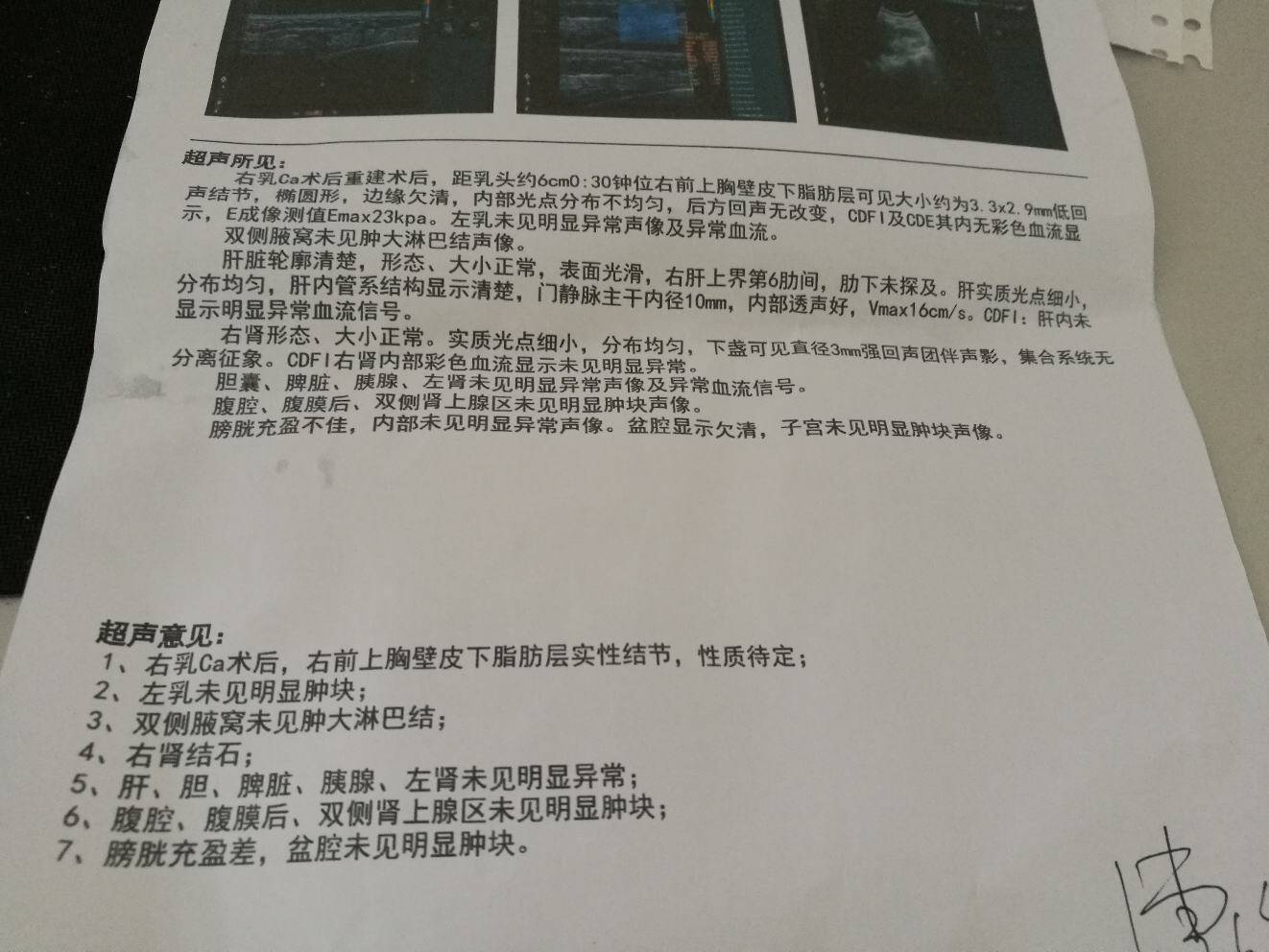 b超又是找的b超室主任做的,在患侧0:30的皮下发现一个3毫米大小的低回声结节,边界欠清,主任说他不好确定性质,做了一下结节的弹性测定,说跟周围组织差不多,比较软,说定期复查,忐忑,拿了报告找外科教授,教授说是腹部脂肪肌肉填充在里面导致的组织改变,说应该没什么问题,就继续观察,下次复查看大小改变。教授说我们不需要刻意去锻炼身体,只要不是躺床上不动的那种,上班了的活动量都足够了,然后说饮食上不需要刻意禁忌,素食为主,适当补充蛋白就行😊