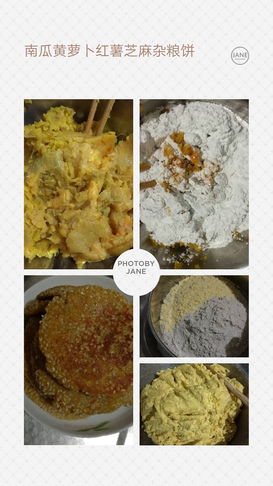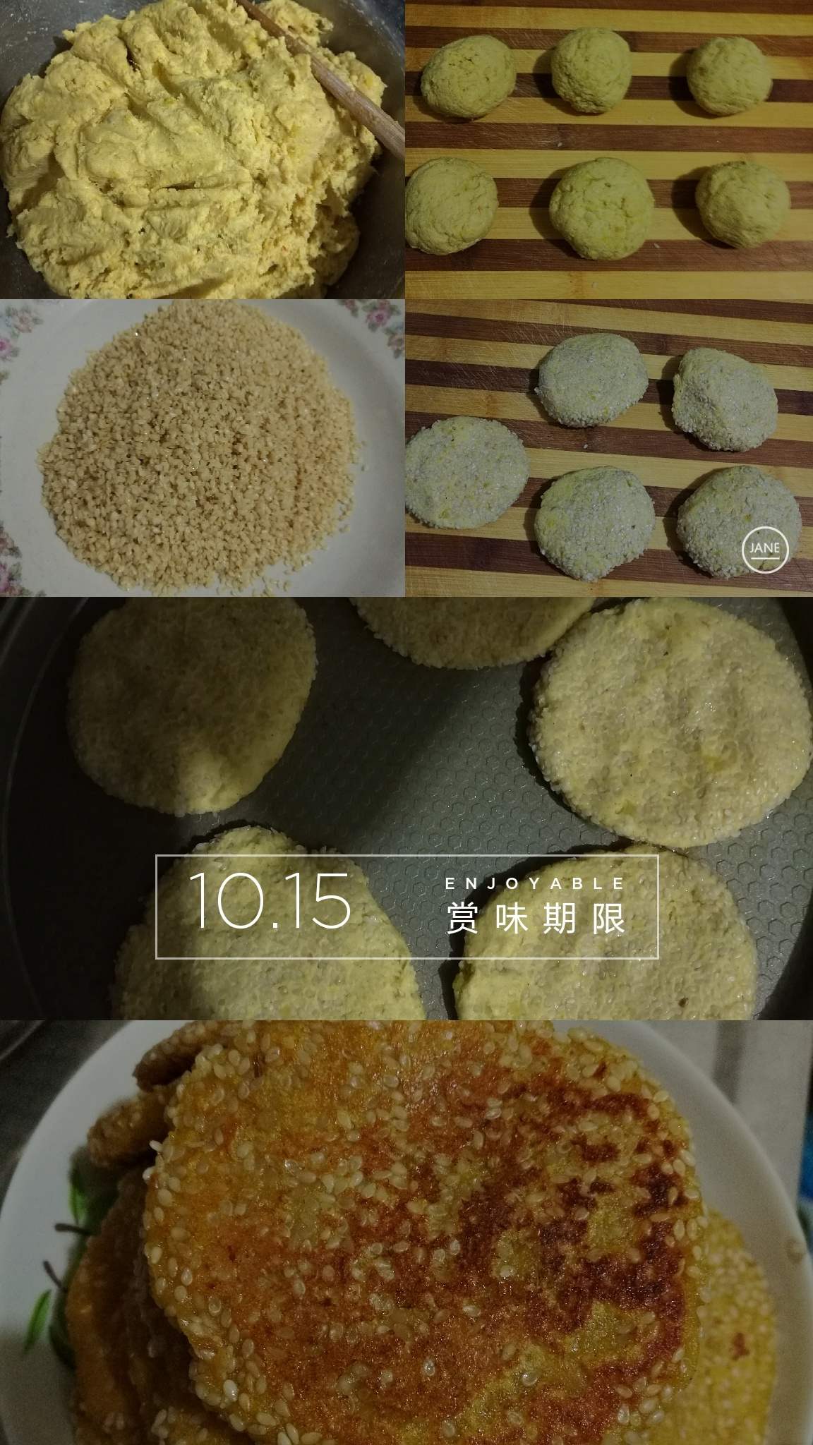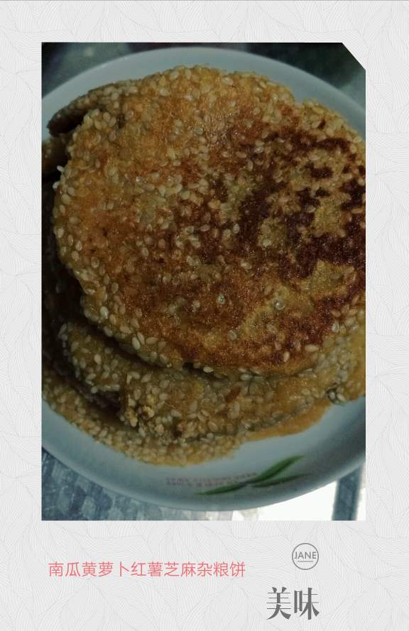 首先将黄萝卜,南瓜,红薯,在锅里蒸熟,放凉,用擀面杖压碎,然后加入糯米粉,玉米粉,荞麦面适量,把面合到软硬适当就行,搓成小圆球,然后在外面裹一层芝麻,压扁,放入电饼锅里烙四分钟就行了。