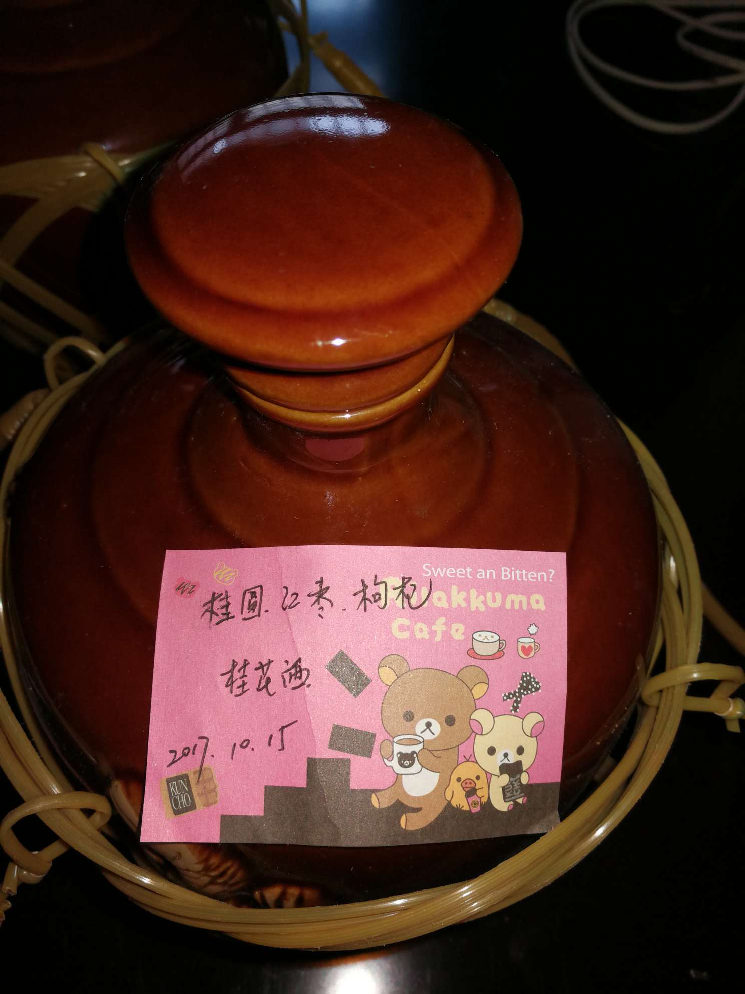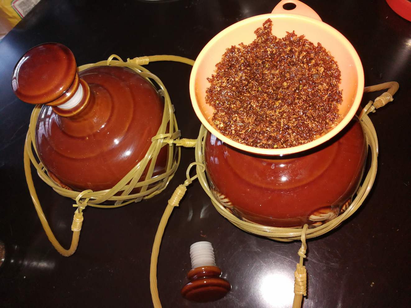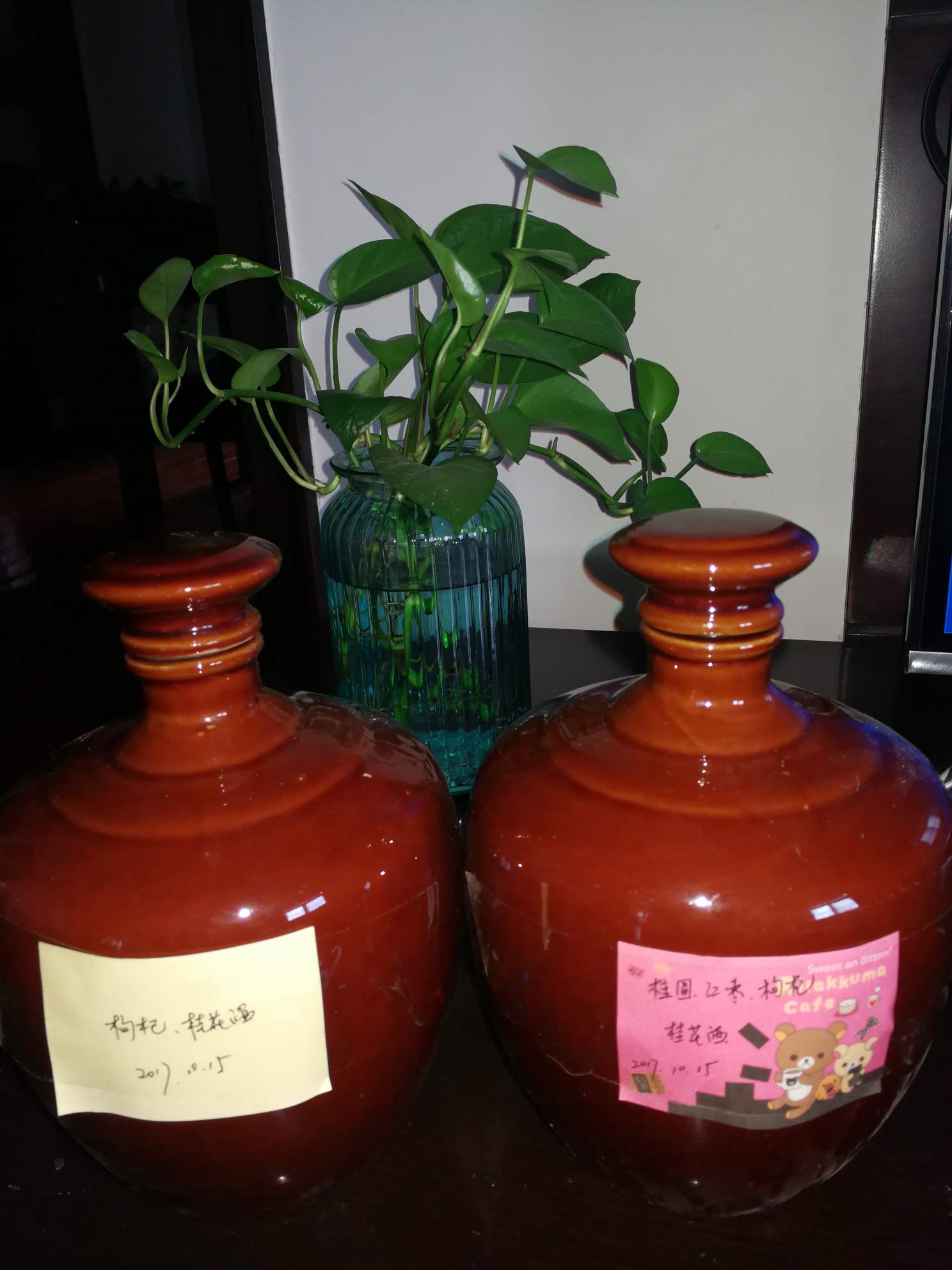 自从去年到宁波女儿处休养学做了糖桂花,今年看到满园飘香的桂花又手痒痒了,参考网上的制作程序,做了两坛桂花酒,枸杞桂花酒适合强壮人喝,红枣、桂圆、枸杞桂花酒适合身体虚弱人喝。切记,我们少喝酒!