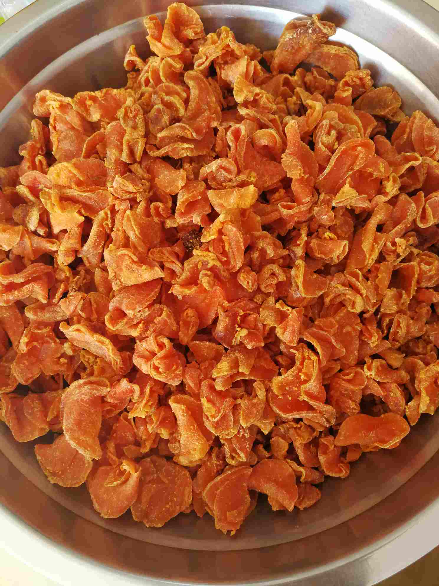朋友说二斤胡萝卜用一斤冰糖,可是我觉得冰糖太多了,就用半斤左右的冰糖,用电磁炉的最小火,把胡萝卜切成片后和冰糖一起放到不锈钢锅里炒,这是慢活,要耐心点,先是糖化了,再慢慢炒,直到糖靠干了,胡萝卜慢慢成果脯,试吃一下,很不错😊