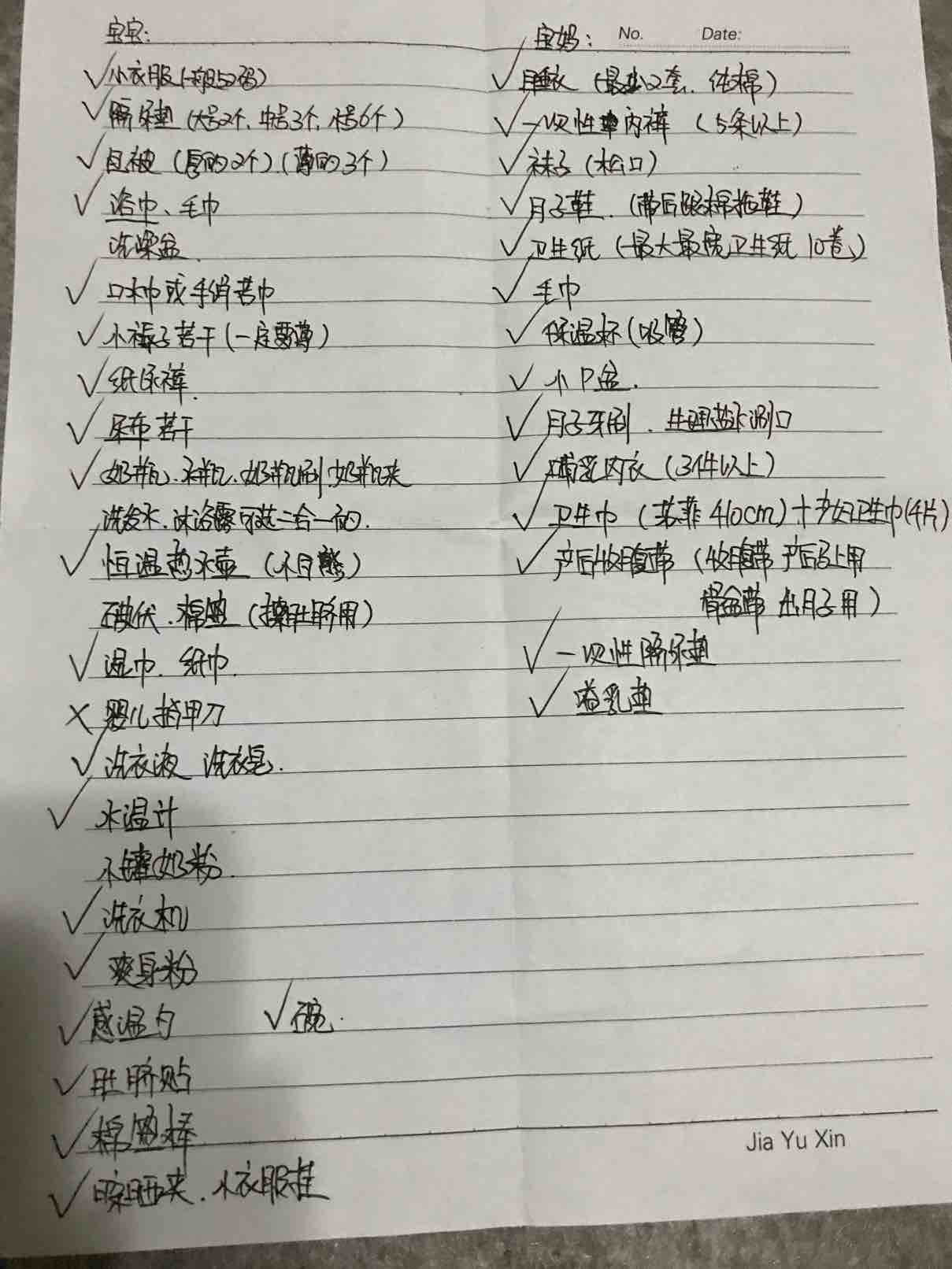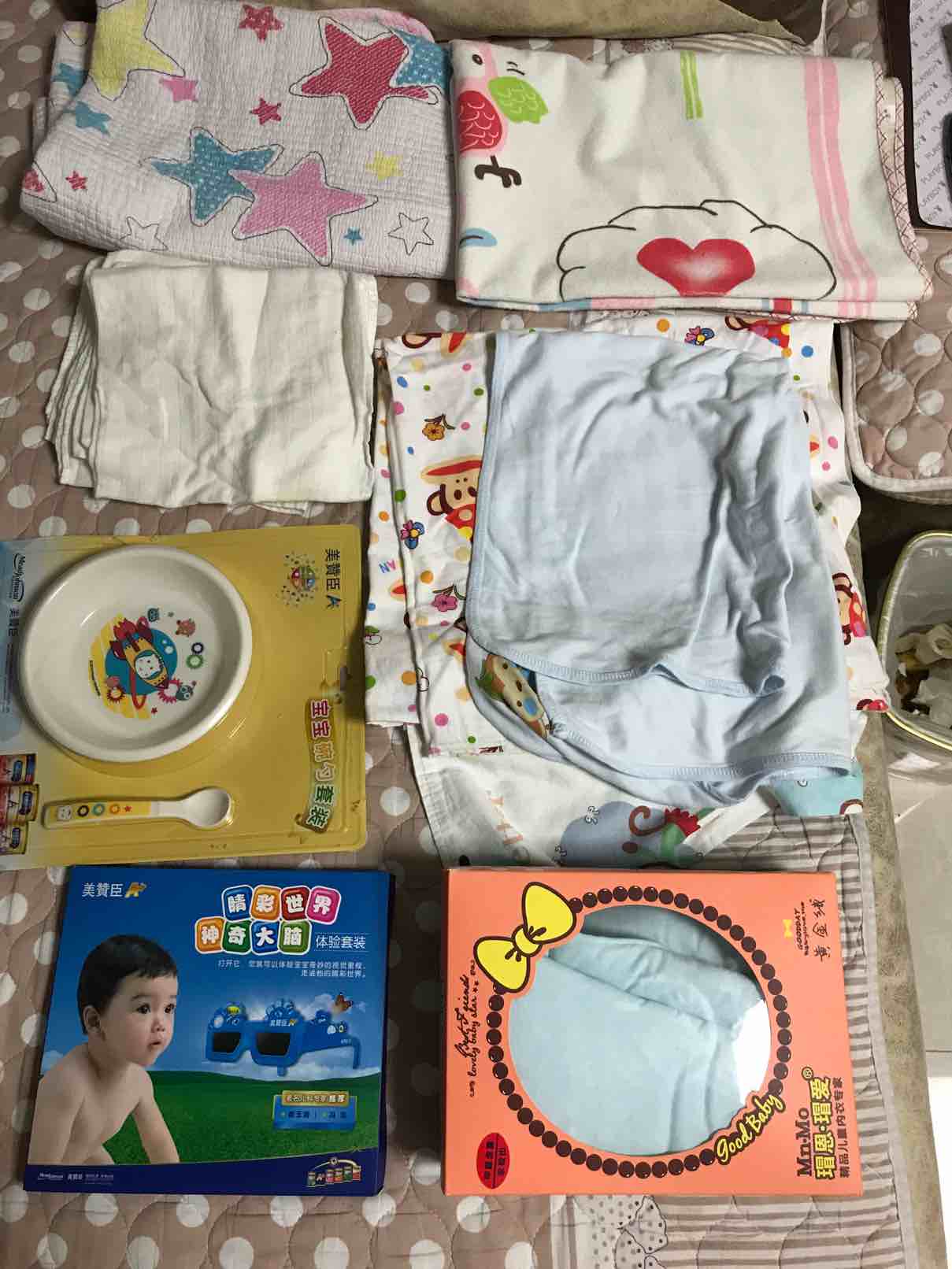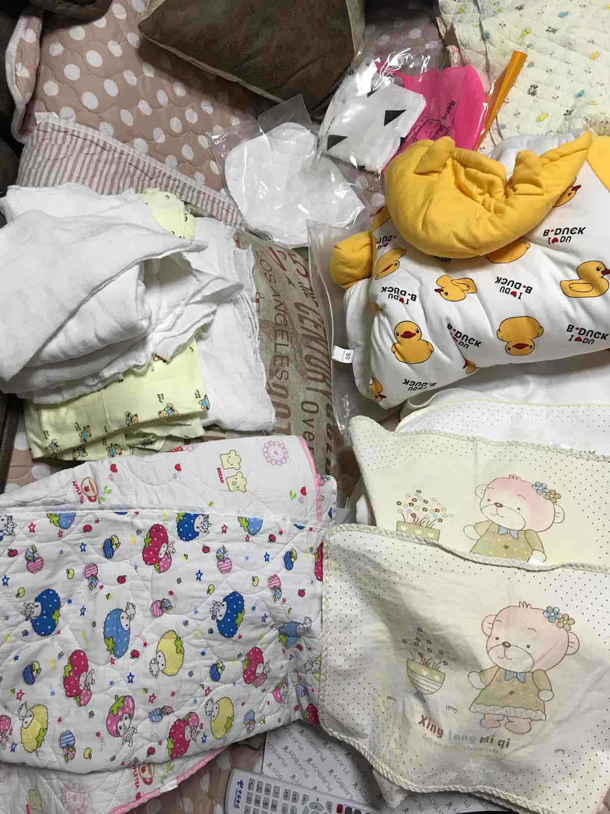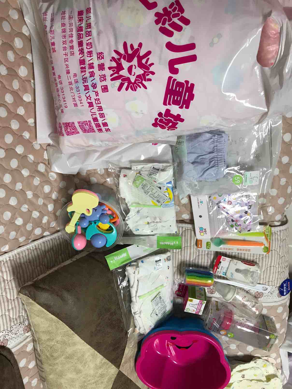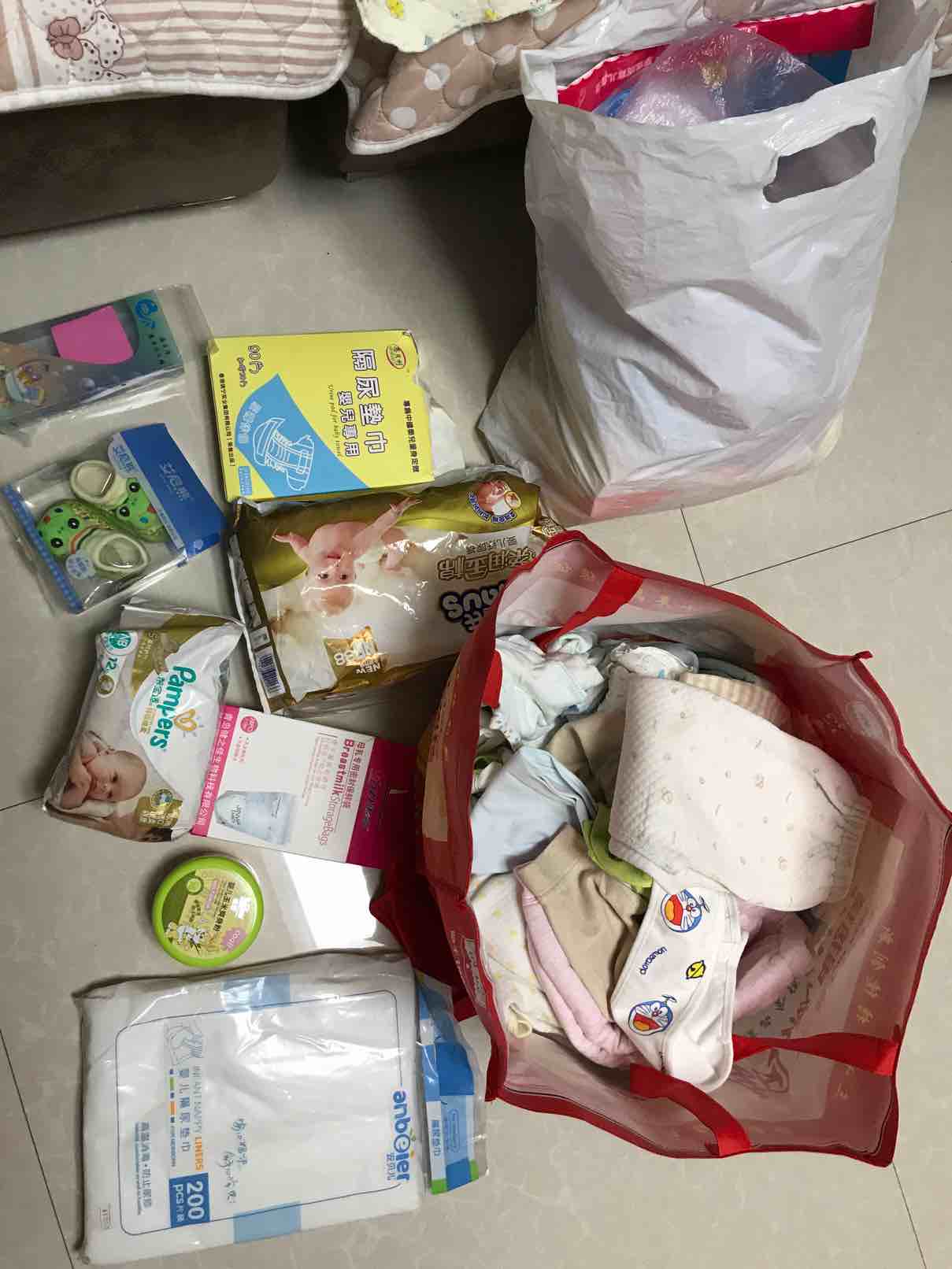 早上先去了我妹妹家,她家宝贝一生日多了,给我找了好多好多小衣服,隔尿垫 尿不湿 纸尿裤 介子 玩具等等,有的东西还是新的没用过的,从她家拿了2个大袋子东西以后,我们又去了孕婴用品店,买的奶瓶 奶嘴 ,我给宝宝只新买了4件新衣服,还买了给孩子洗衣服专用的迷你洗衣机,做了2个新被子,2个褥子,2个小垫子,在网上又买了新生儿用的肚脐贴,棉签,隔尿裤,隔尿垫,口水斤,介子,浴巾,恒温水壶。给自己买了2身纯棉的月子服,棉拖鞋,收腹带,月子牙刷,毛巾,一次性裤头,溢乳垫等等,接下来的日子我就等着在家里天天收快递吧!我把宝宝和我需要的东西几乎全部准备好了!