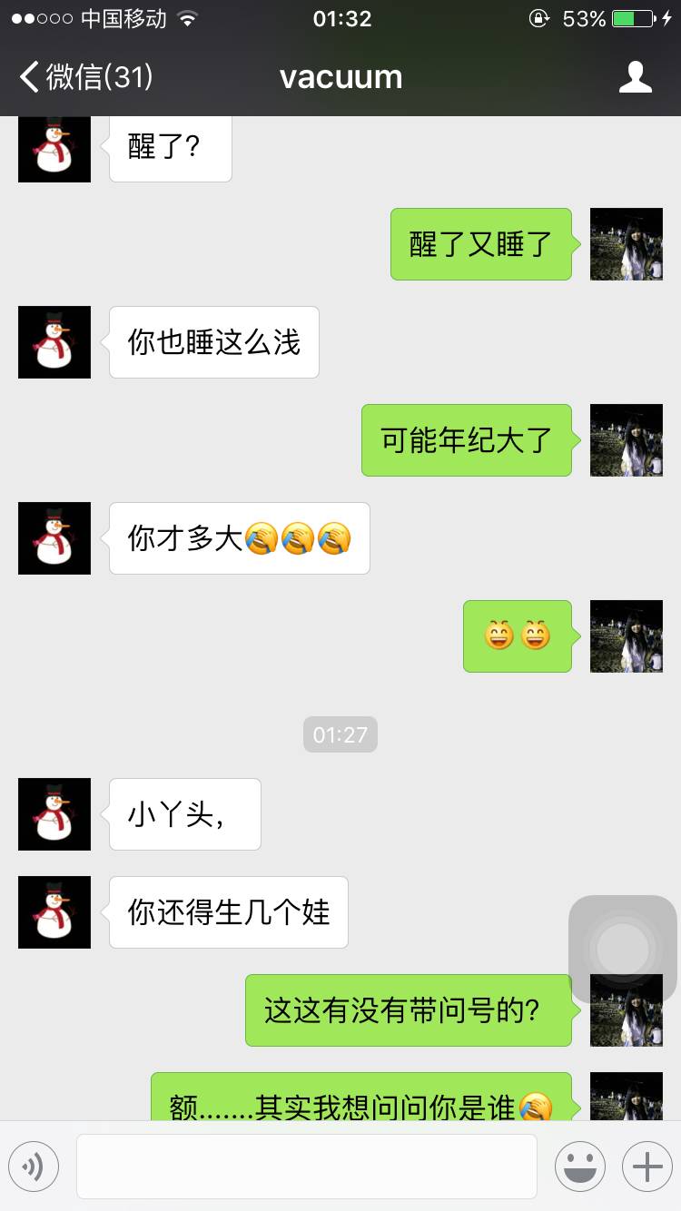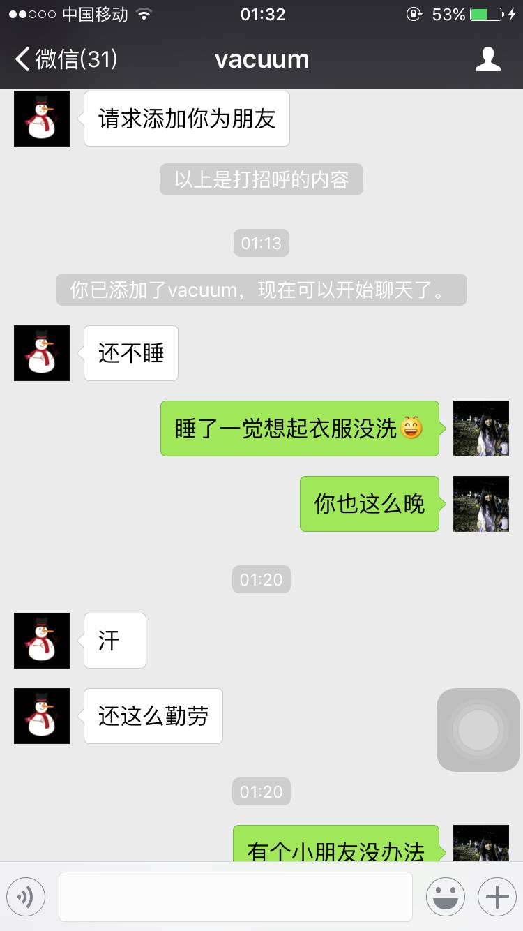 本已经睡了,想起衣服还没洗,爬起来洗衣服。明天要去我妈那里,看视频小家伙会爬了,她放假一天,叨叨着让我带过去。洗完衣服有人加我,以为是之前一学员介绍来考驾照的就没多想,聊着,发现不对,这感觉像个许久不见的老朋友一样.......