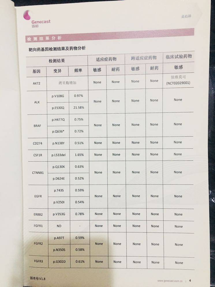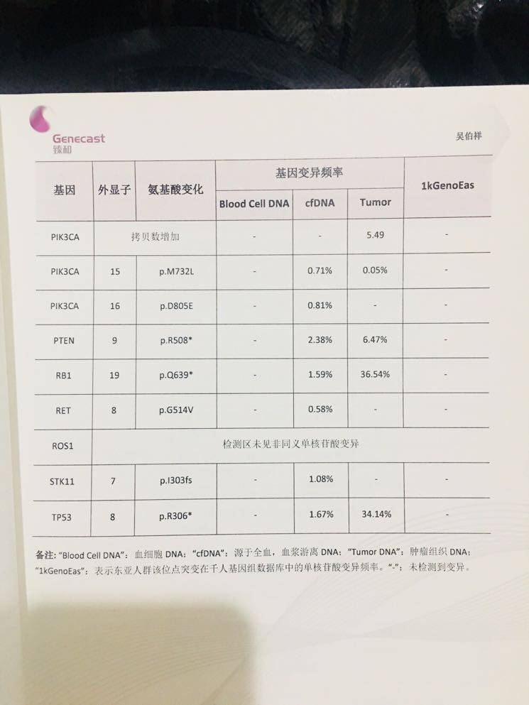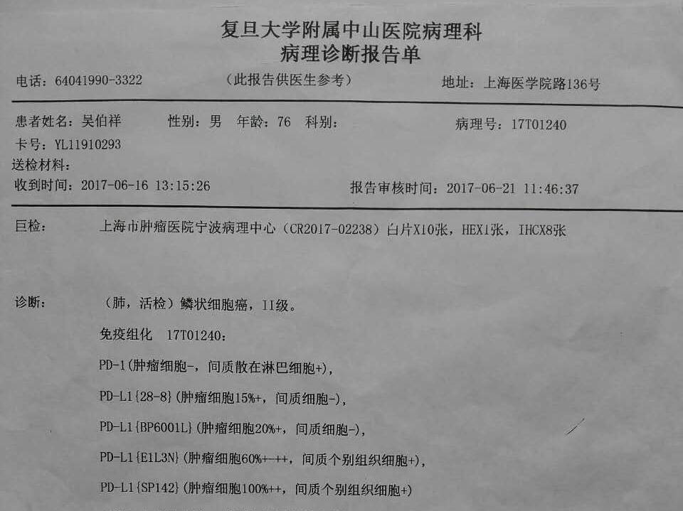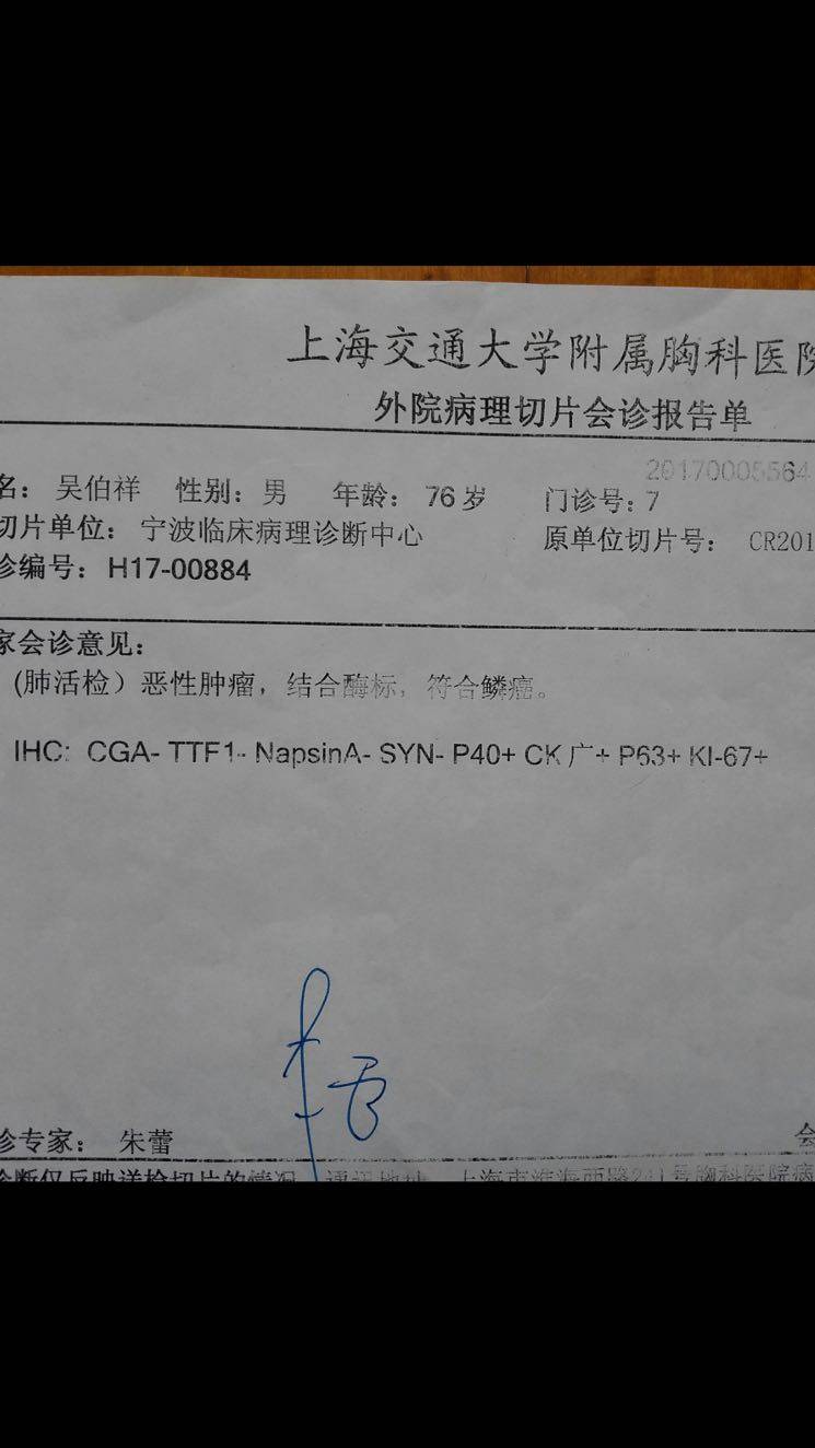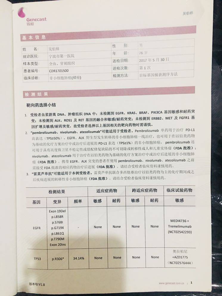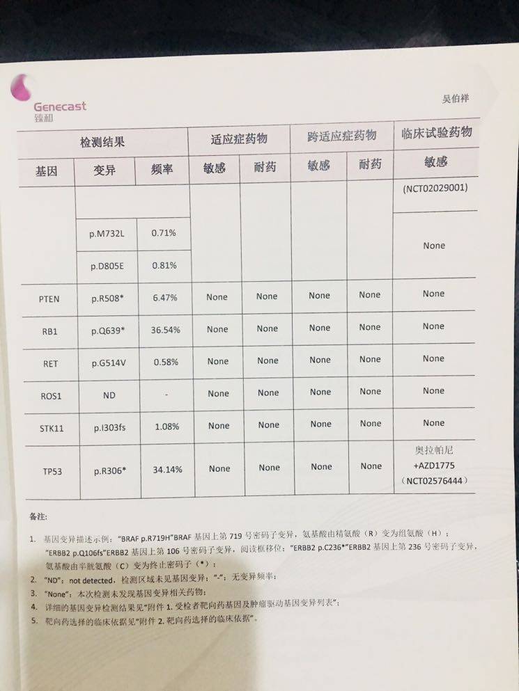 我爸在5月19号以肺炎收住宁波第一医院、27号确定非鳞、接下来一系列所有检查:PET、穿刺、基因检测、病理报告等几乎同步进行!差不多宁波住一个多月转院到上海医院!到上海就进了阿斯利康的I药、等一个月空仓结果进了化疗组、7月15日一化:健泽加顺铂!一化后副作用厉害而且无效果、22号自己决定退组出院回家!八月14去奥门打了第一针O、104斤140豪克!基因检测全阴没有吃过靶药、PDI有表达(PDi的表达是上海等临床时做的)我们查出来后两个半月打了第一针的O药、期间就一次化疗、一直吃孢子粉!其它没有任何治疗和药物!因陈医生建议以供方便大家参考、我把我们的基因检测报告书和表达和病理报告单等全部拍下来供大家、谢谢陈医生为我们患者如此努力辛苦研究、为你如此的高尚医德点赞!一次只能发八张图片、其它我都发下面的回复贴里