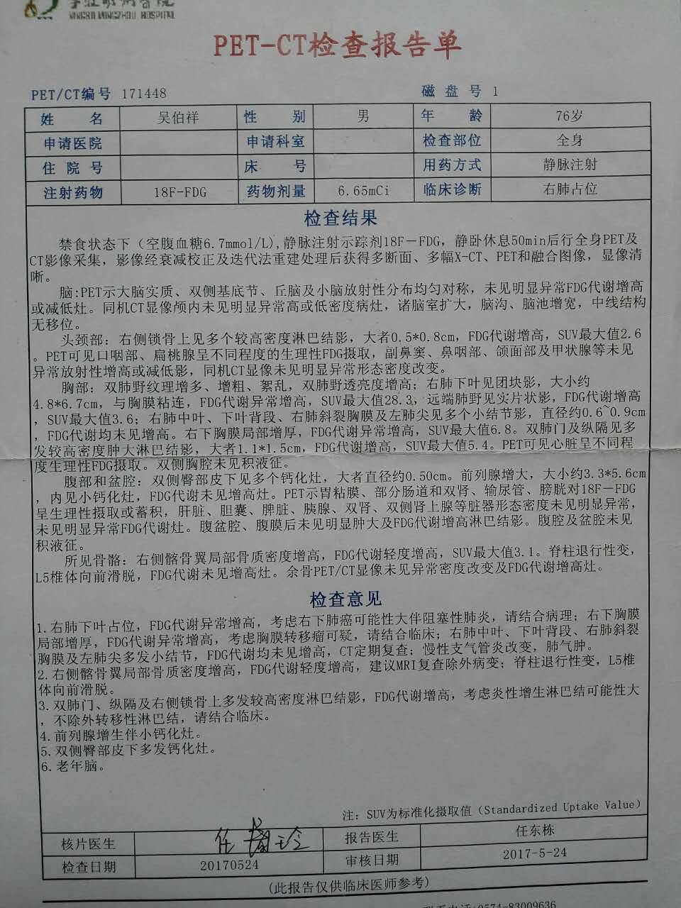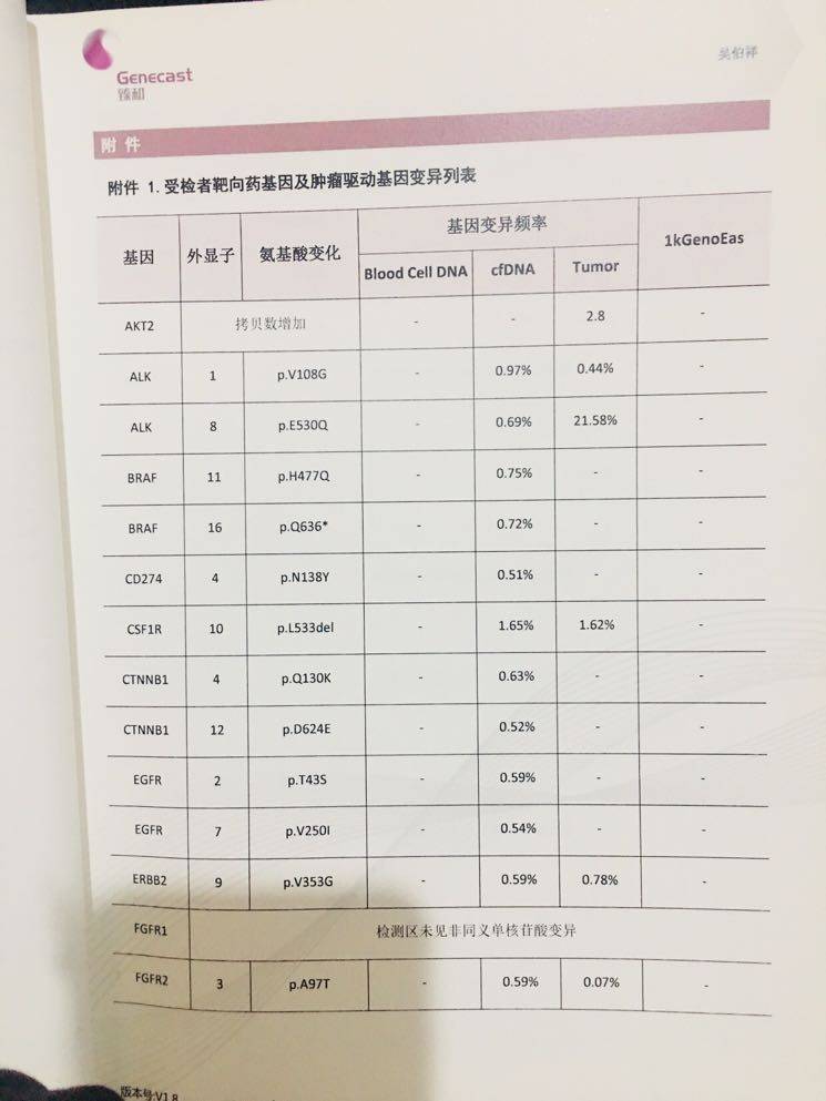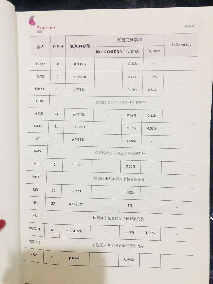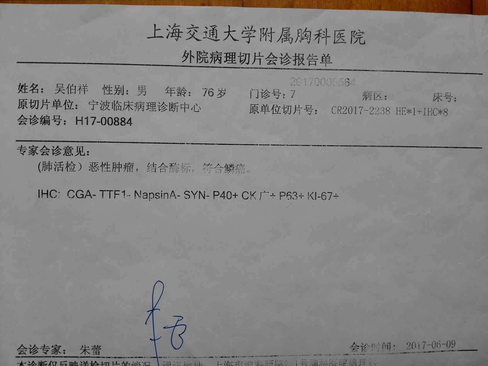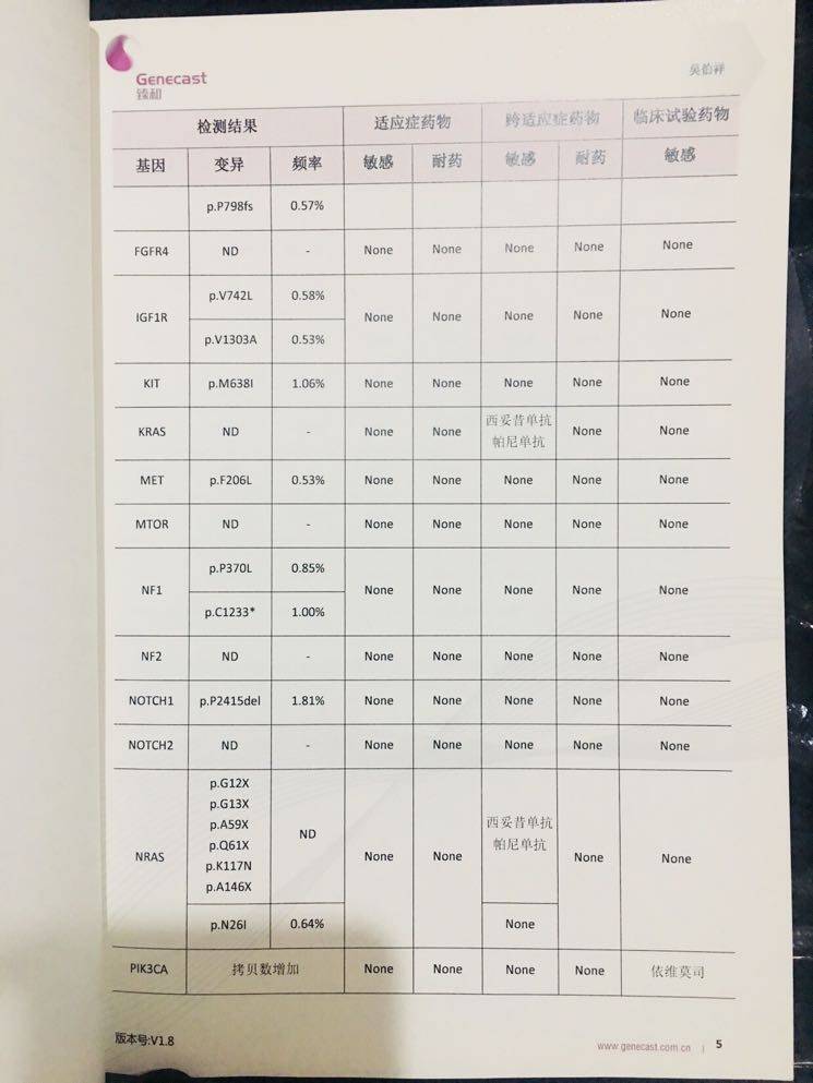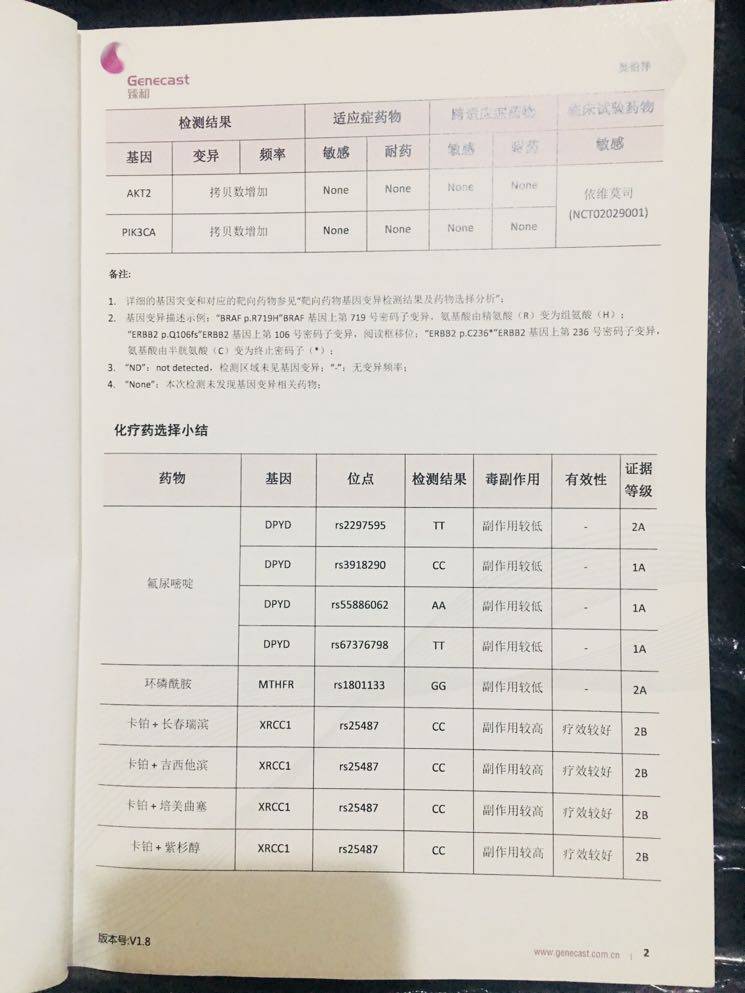 我爸在5月19号以肺炎收住宁波第一医院、27号确定非鳞、接下来一系列所有检查:PET、穿刺、基因检测、病理报告等几乎同步进行!差不多宁波住一个多月转院到上海医院!到上海就进了阿斯利康的I药、等一个月空仓结果进了化疗组、7月15日一化:健泽加顺铂!一化后副作用厉害而且无效果、22号自己决定退组出院回家!八月14去奥门打了第一针O、104斤140豪克!基因检测全阴没有吃过靶药、PDI有表达(PDi的表达是上海等临床时做的)我们查出来后两个半月打了第一针的O药、期间就一次化疗、一直吃孢子粉!其它没有任何治疗和药物!因陈医生建议以供方便大家参考、我把我们的基因检测报告书和表达和病理报告单等全部拍下来供大家、谢谢陈医生为我们患者如此努力辛苦研究、为你如此的高尚医德点赞!一次只能发八张图片、其它我都发下面的回复贴里