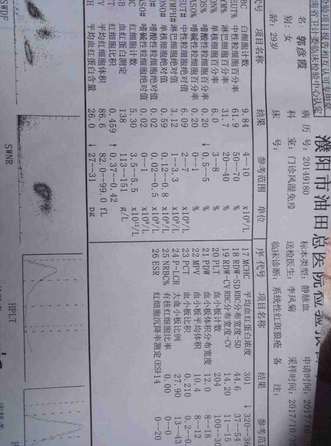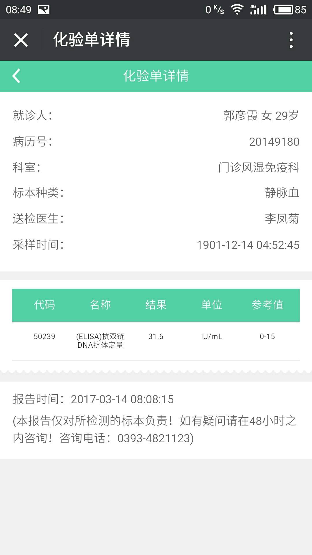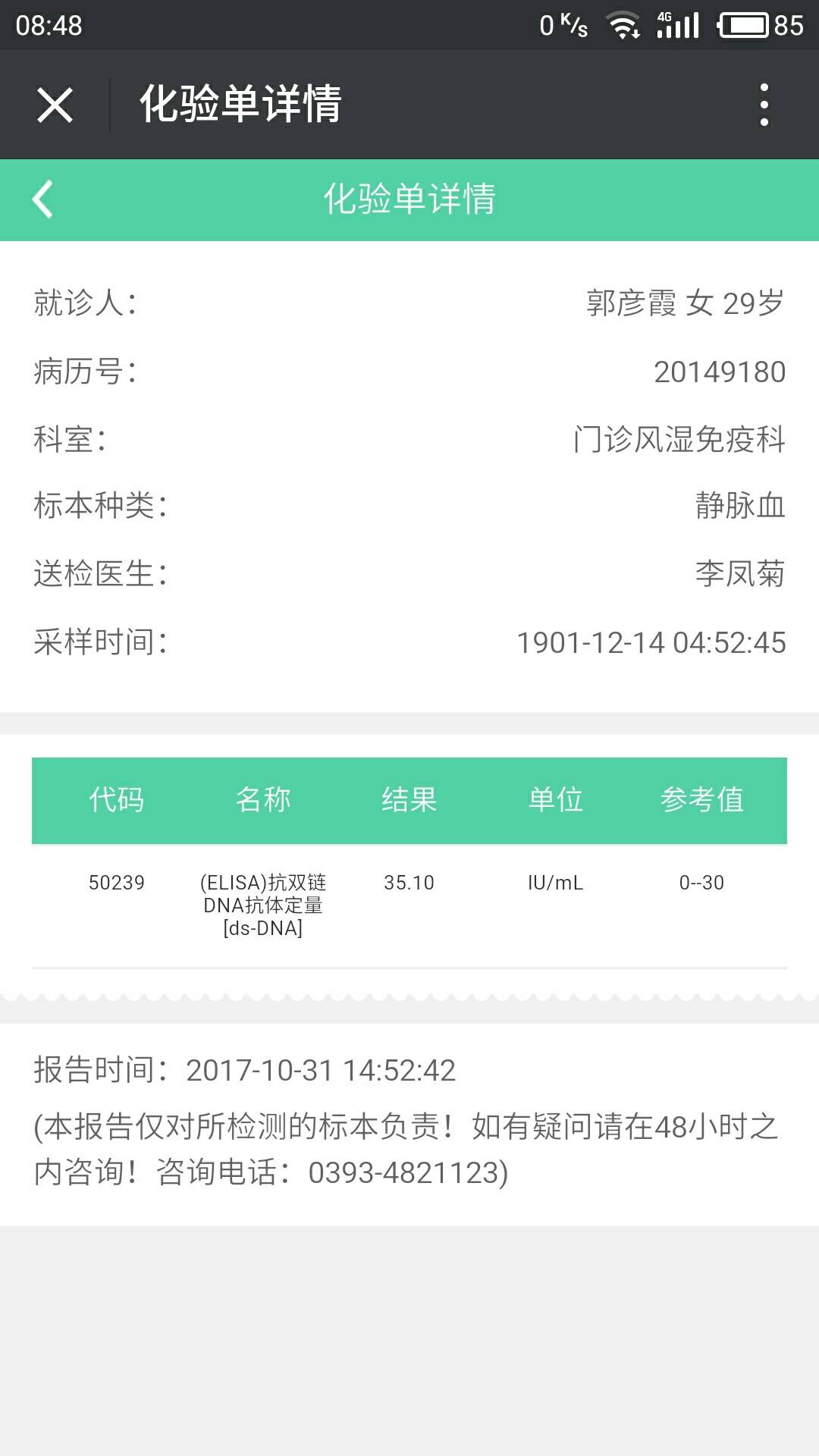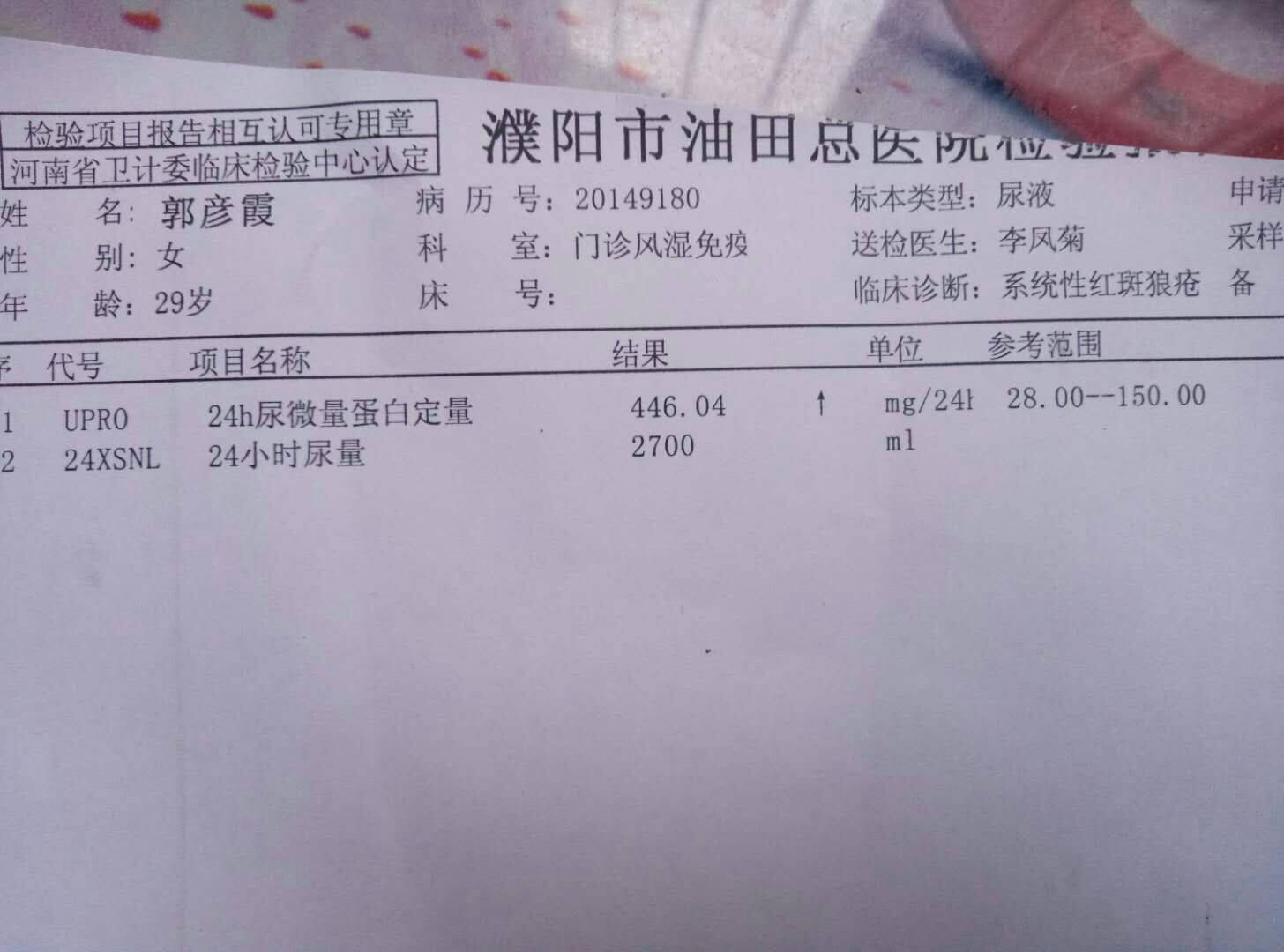 风湿科更是离谱,本来两点上班,医生到三点半了才来,我又因为看妇科直接排到了14号,一直等到五点才看到,医生说结果还可以,那个尿常规2 估计不是很准,因为24小时446mg,按理来说不该2 。以前这个医生说蛋白如果不转阴是不让怀孕的,现在又说只要控制在0.5g一下就可以考虑,原来医生的观念也在改变啊!可惜我现在不考虑孩子的事了,所以医生说还是按照现在这个药量吃,那个环孢素一般都吃6-8个,我现在吃3个药量已经很少了,为了降蛋白加一个也可以。激素还是两个不变,纷乐3个,钙片。对了,我这次让医生帮我开了骨化三醇,因为生病这么多年医生一直没让吃过这种药,但是我看大家好像都有吃,而且感觉最近膝盖特别容易扭到,扭到的时候突然就很疼,然后休息会儿就会好,不知道是不是骨质疏松。抗双链dna抗体结果昨天才出来,北京复查的每次都是阴性,我知道是正常的。但是在老家查的是定量,每次都偏高,不知道哪个比较准,而且我发现这次和3月份那次的参考值都不一致,这次是0-30结果是35.1三月份那次是0-15结果是31.6,因为昨天才出来结果所以我也懒得再去医院问医生了。