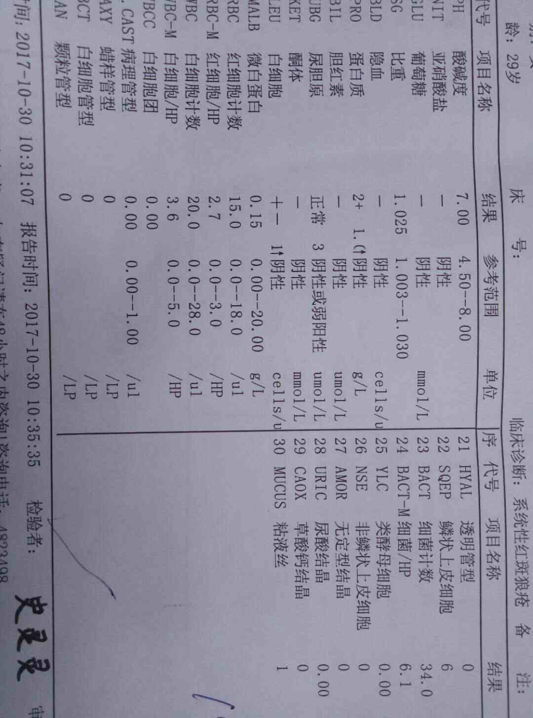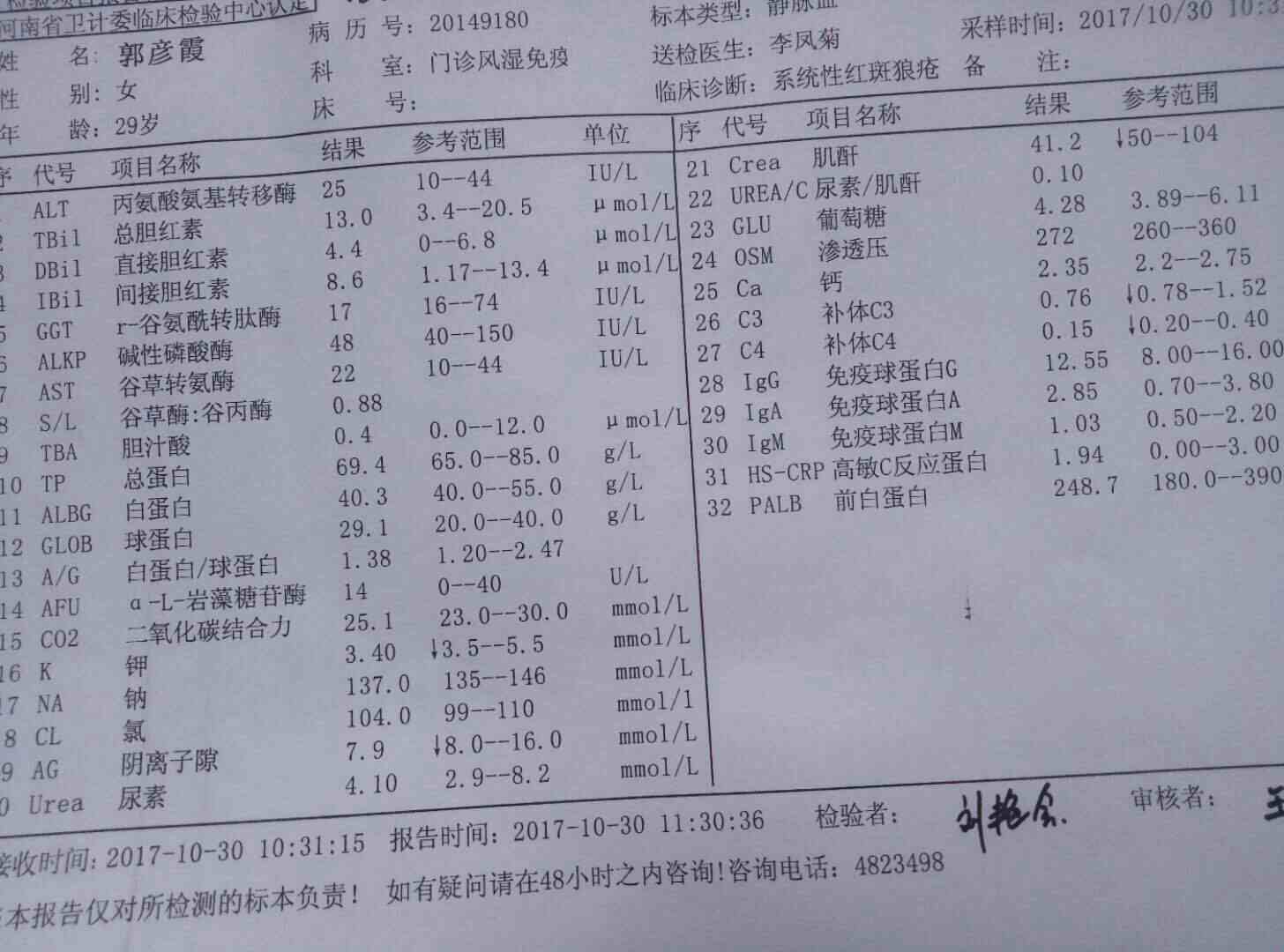 总之这次的复查结果还是不错的,跟以前比有好几个都变好了,比如血红蛋白高了,不贫血了,白蛋白也正常了,反应蛋白和血沉这次也正常,肝肾功能也正常,本来腿上一直有淤青,担心血小板低了但是也是很正常的,虽然一直也都正常。淤青可能是吃激素时间太长皮肤变薄了才这样的,所以也不纠结了。肌肝一直一来是偏低的,我上网看了说没多大意义,加强营养就好,补体3一直也是有点低的,到没有低很多所以不管它。尿蛋白我只求保持在0.5以下就好,要求不高,哈哈,以后也要保持这样就好了!!希望大家也能一直保持稳定,越来越好!