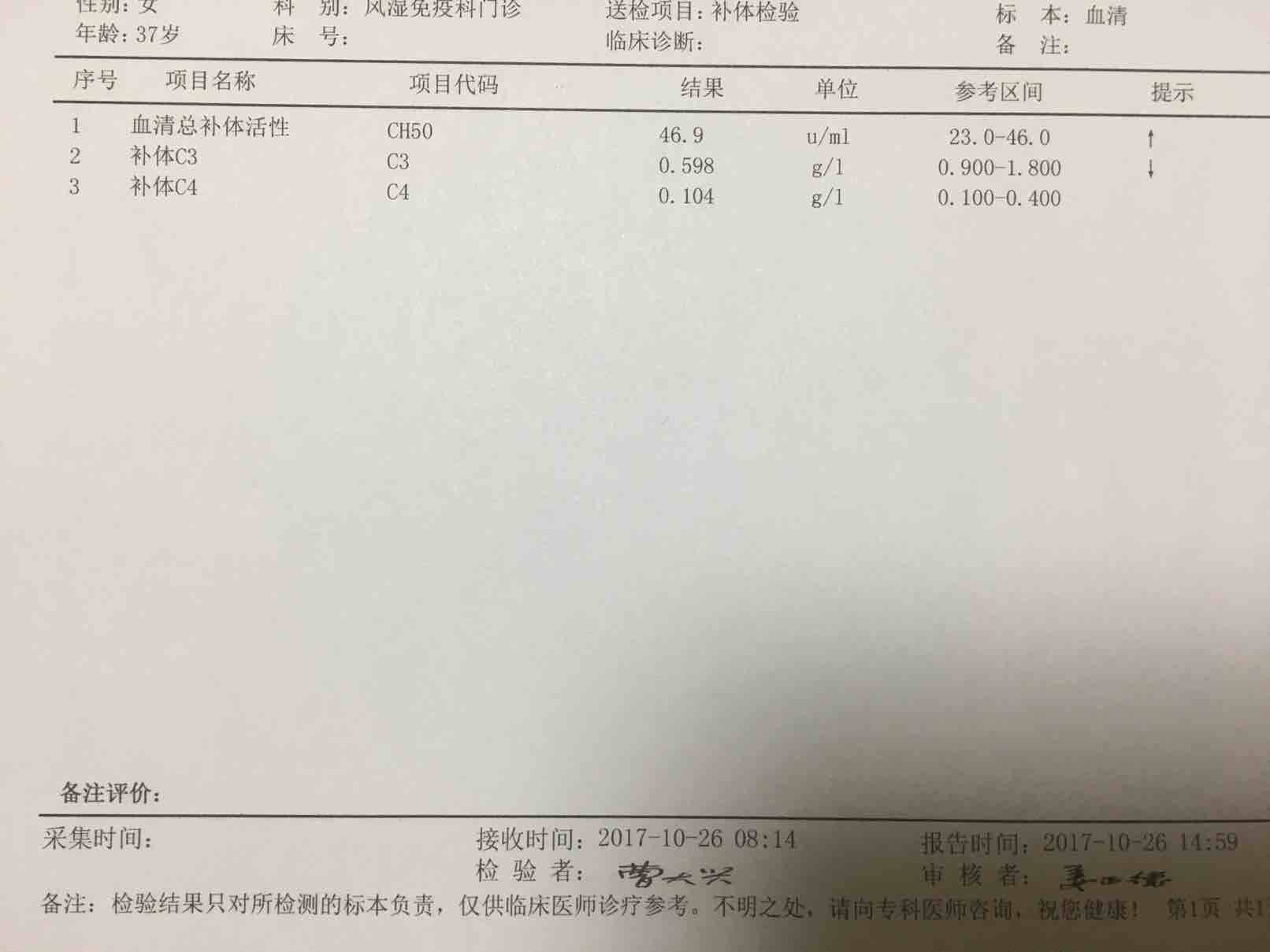 上周10月26日去复查,C4居然正常了,但C3却比上次的又低了些,大夫让继续减激素,3片隔天吃一个月减成2片半,隔天吃一个月,再减成2片隔天吃一个月后复查。其它药不变,大家说我这种情况,赛可平一天6粒量是不是很大?大夫说因为C3仍不正常,只能先减副作用最大的激素。