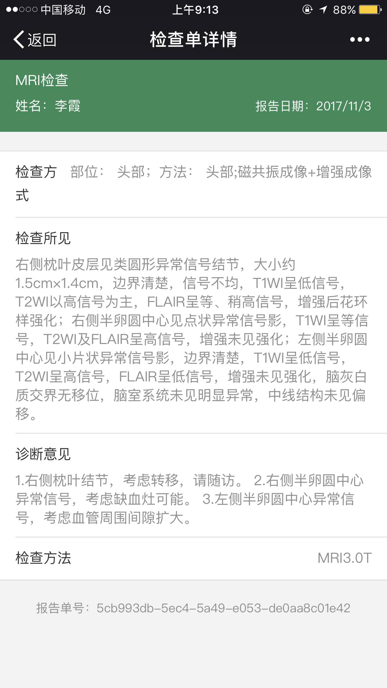 现在关键是头部有1cm多的肿瘤,因为前面没有做过头部核磁共振所以没有办法对比头部这个是吃药前还是后面长的,每天头持续痛