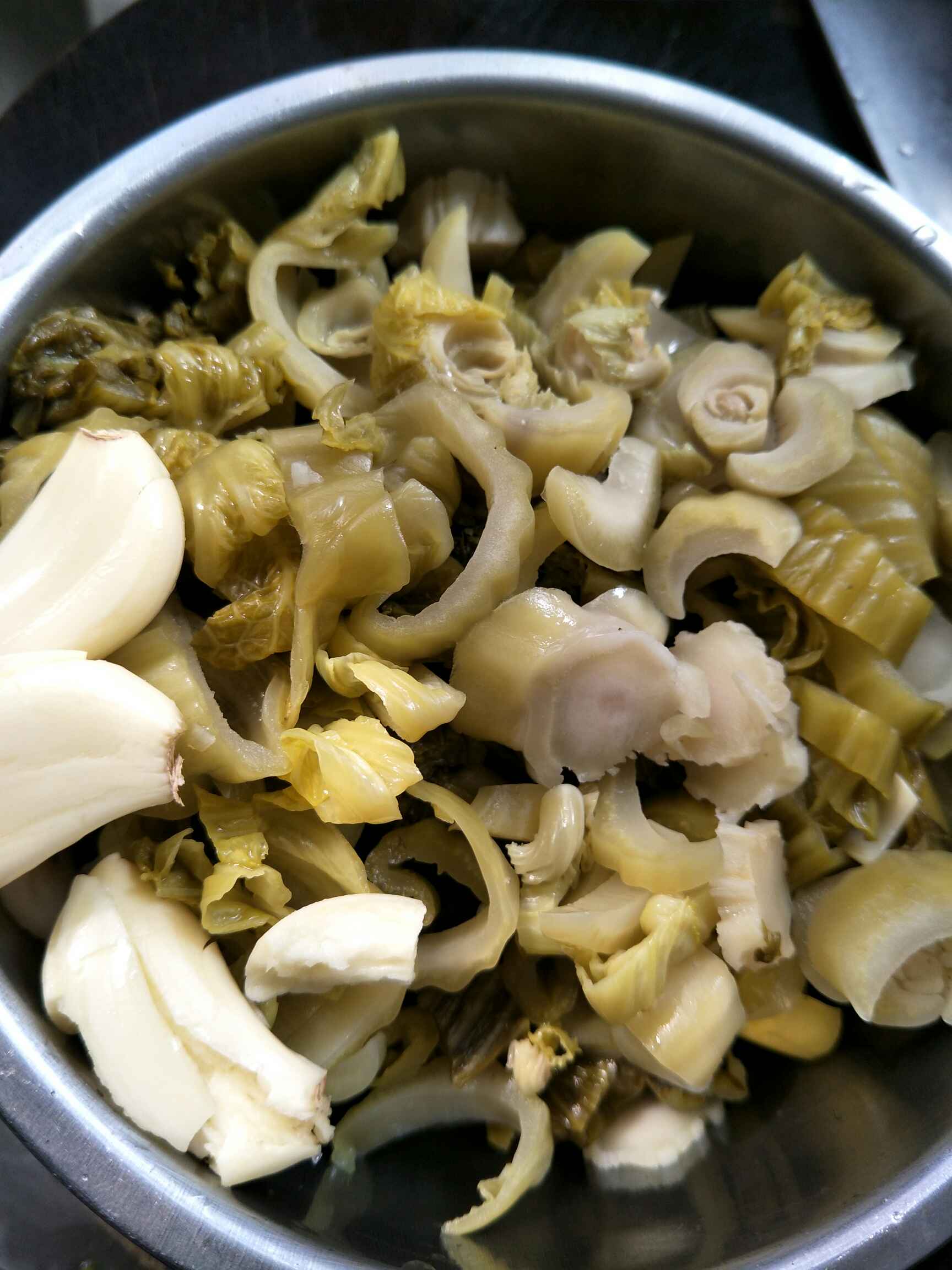 2.把酸菜加蒜头炒熟,调好味道,待用!