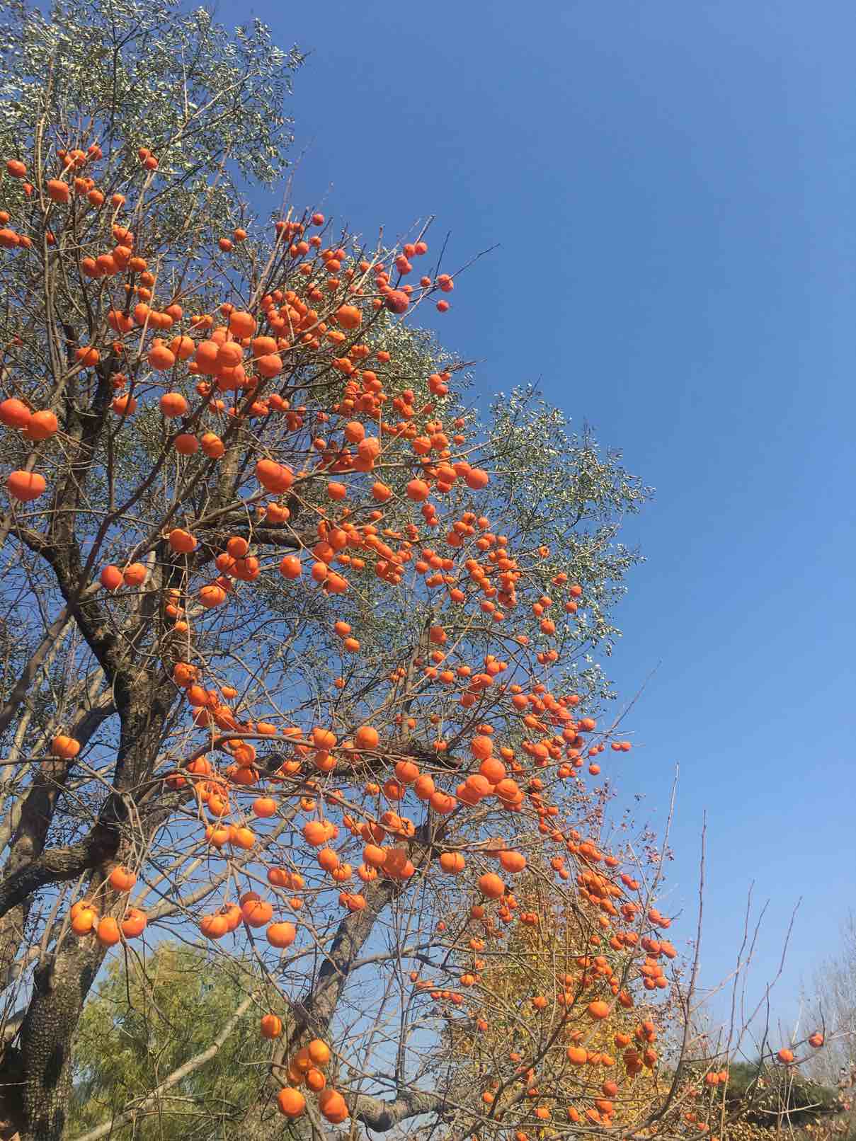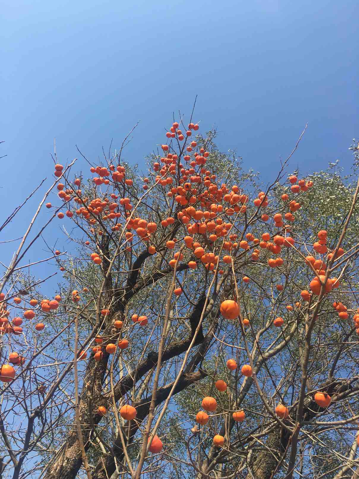 第一次看到挂满树枝的柿子,蓝天白云碧水