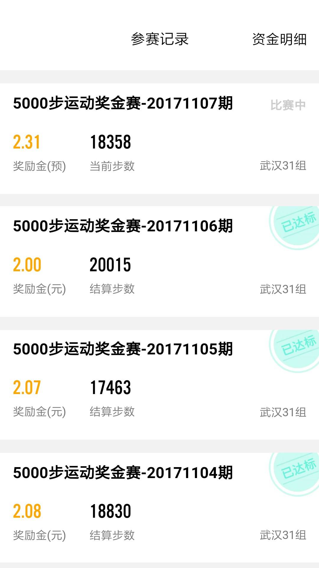 参加QQ运动里的5000步运动奖金赛,已参赛了19次,达标100%。现在每天走步1万步以上,对我来说已是很轻松的事。参赛只是约束自己要坚持。