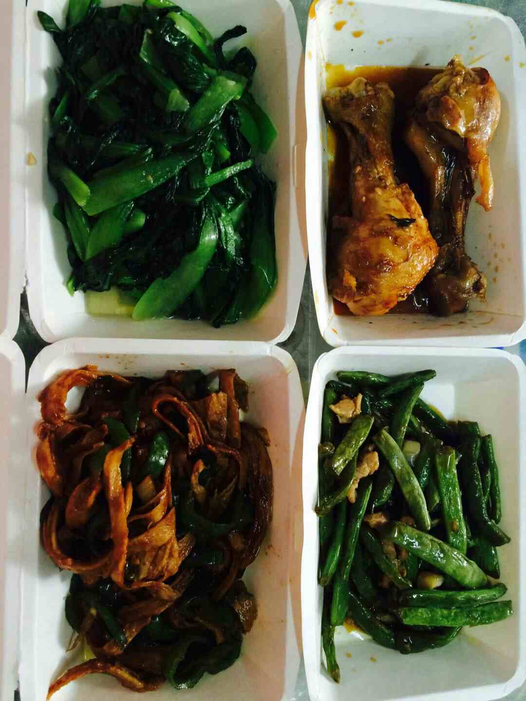 今天老妈不在家我和我爸外面买的菜吃,鸡腿,青菜香菇,四季豆烧肉,青椒面筋,一共24块钱,吃饱