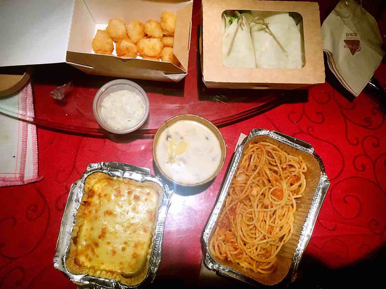 小伙伴约我晚上出去浪,我说难得不培训的晚上要赶紧回家补觉的,她说不知道你哪里来的自带年薪百万的干劲的[捂脸],然后吐槽完我,去了一家我比较喜欢的西餐厅,买了我爱吃的,意大利风情意面,不带蘑菇的奶油蘑菇汤,芝士焗红薯,龙利鱼球配塔塔酱,墨西哥牛油果卷,送到单位来了,说快吃吧,别过劳死了