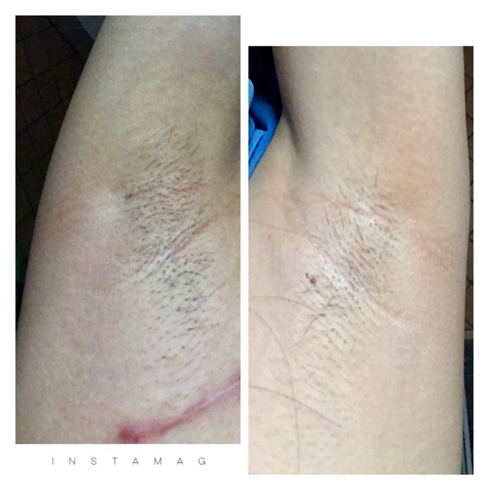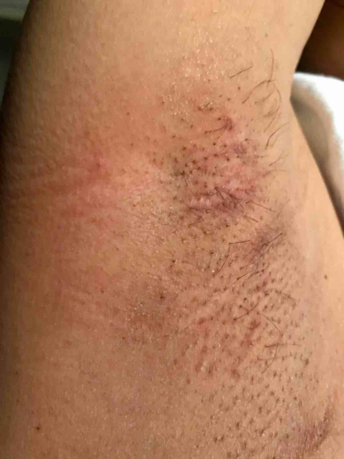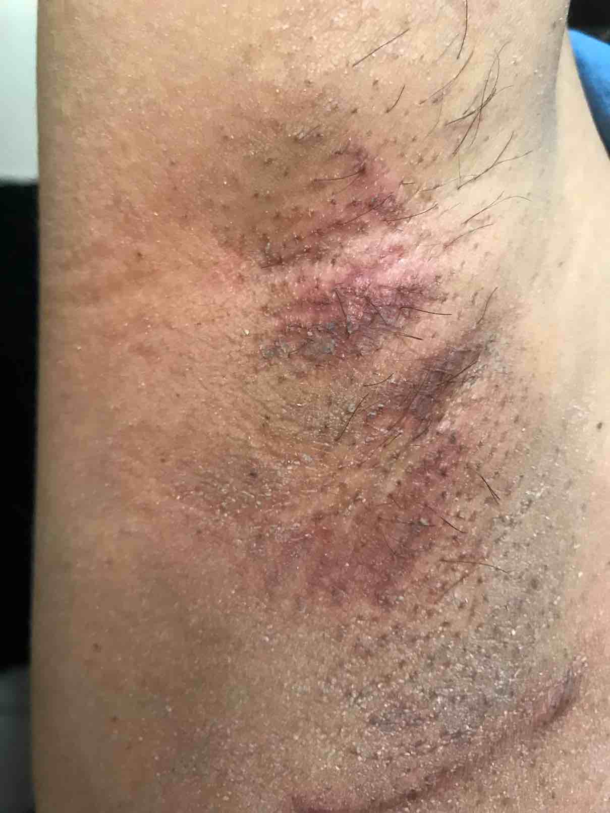 腋下开始变色发黑,从皱褶处开始。左右两边腋下的对比图。手臂内侧也开始灼红。