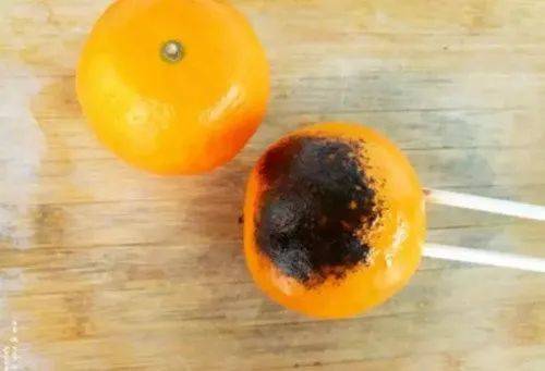 3、要来回地翻动,烤至橘皮刚刚变黑,就马上翻到另一面,直到整个橘子都烤黑。