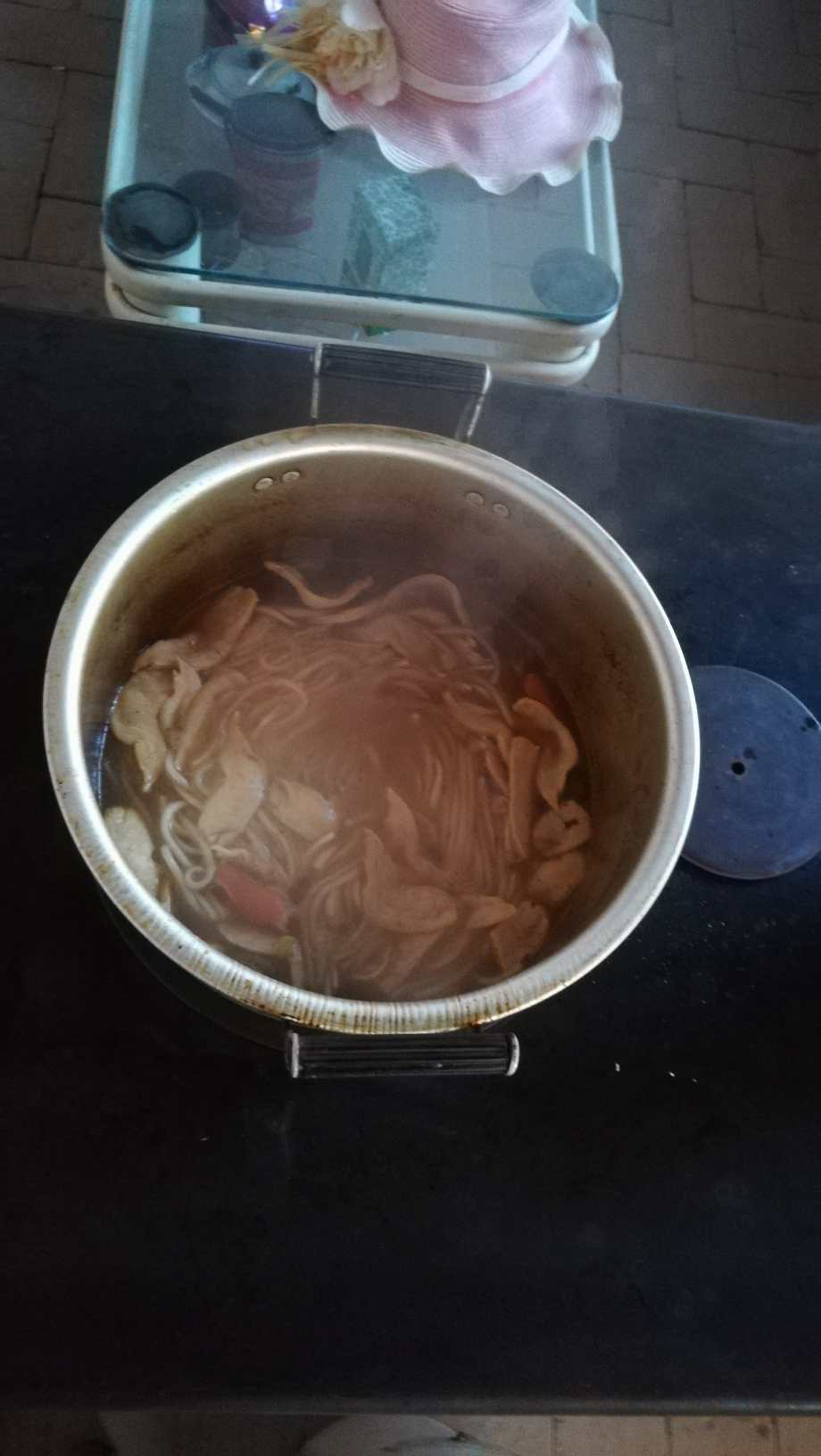 上次煮肉的汤有剩,倒掉可惜了,妈妈晚上用来煮菜吃了