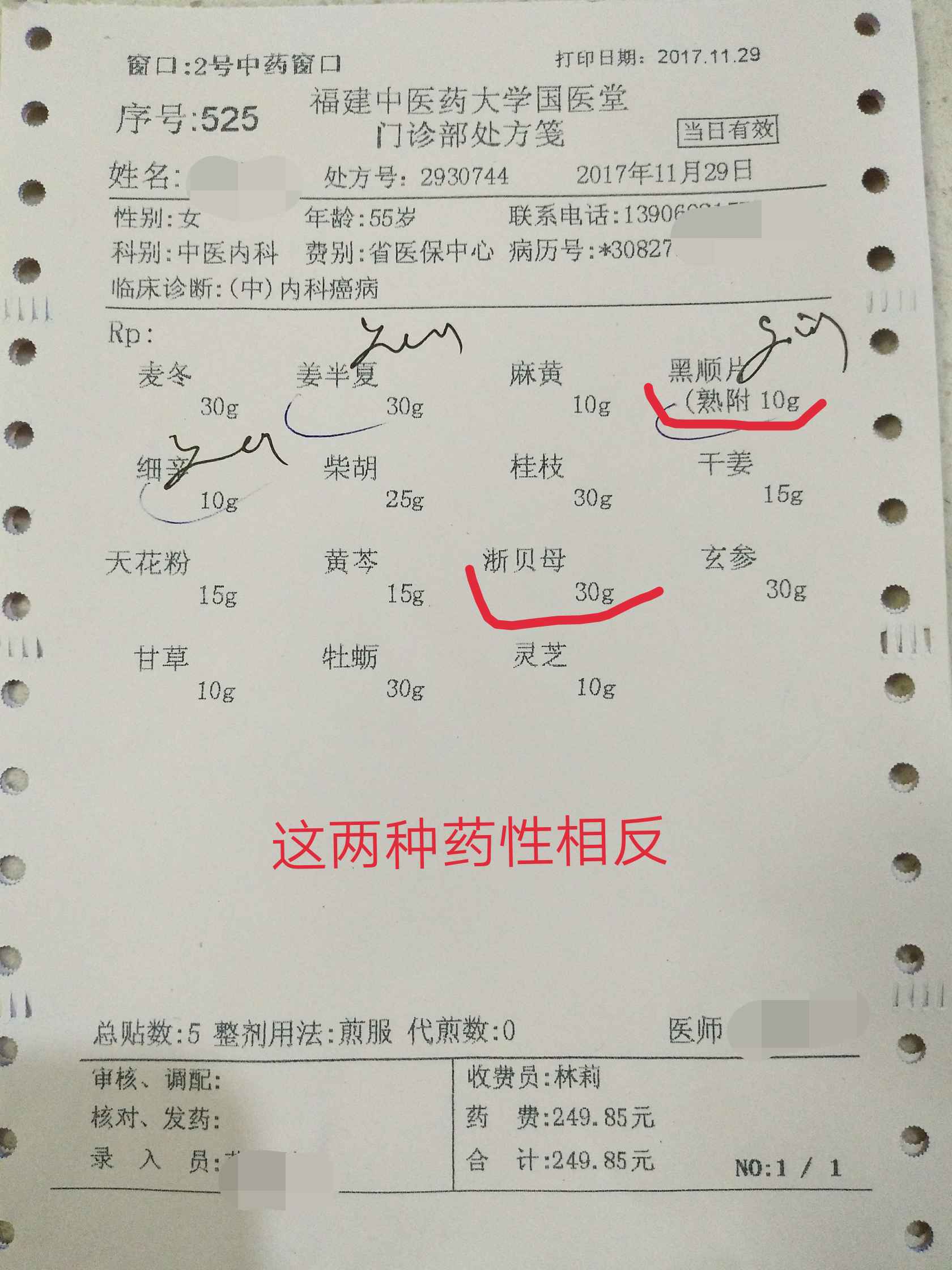 昨天去拿中药,药房人特别交代我,叫我拿去医生签字时,要我告诉医生,药方里有十八反药,因为我们药方里好多药超量了,每次都是要再拿去医生签字确认,其实,医生一开始就知道了,因为我们是转方,医生说的时候,我们已经吃三个多月了,到现在是吃3年了,昨天回家后,特地百度了一下,才知道相反药配伍会严重中毒,我想医生应该是看到重病所以才下了猛药。