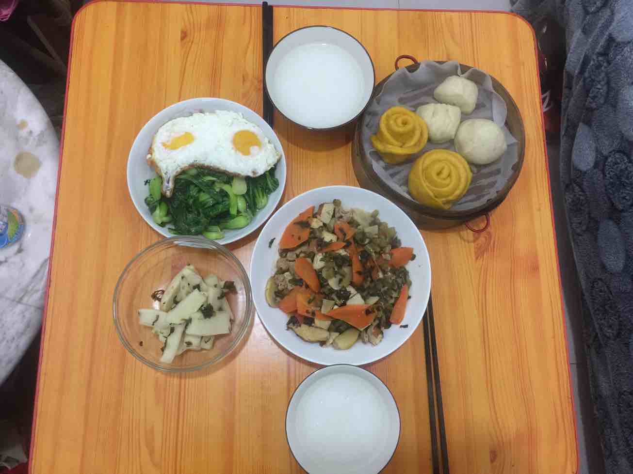 煎蛋,炒青菜,肉沫香干蘑菇炒腌菜,腌萝卜,小馒头,一人一碗小稀饭