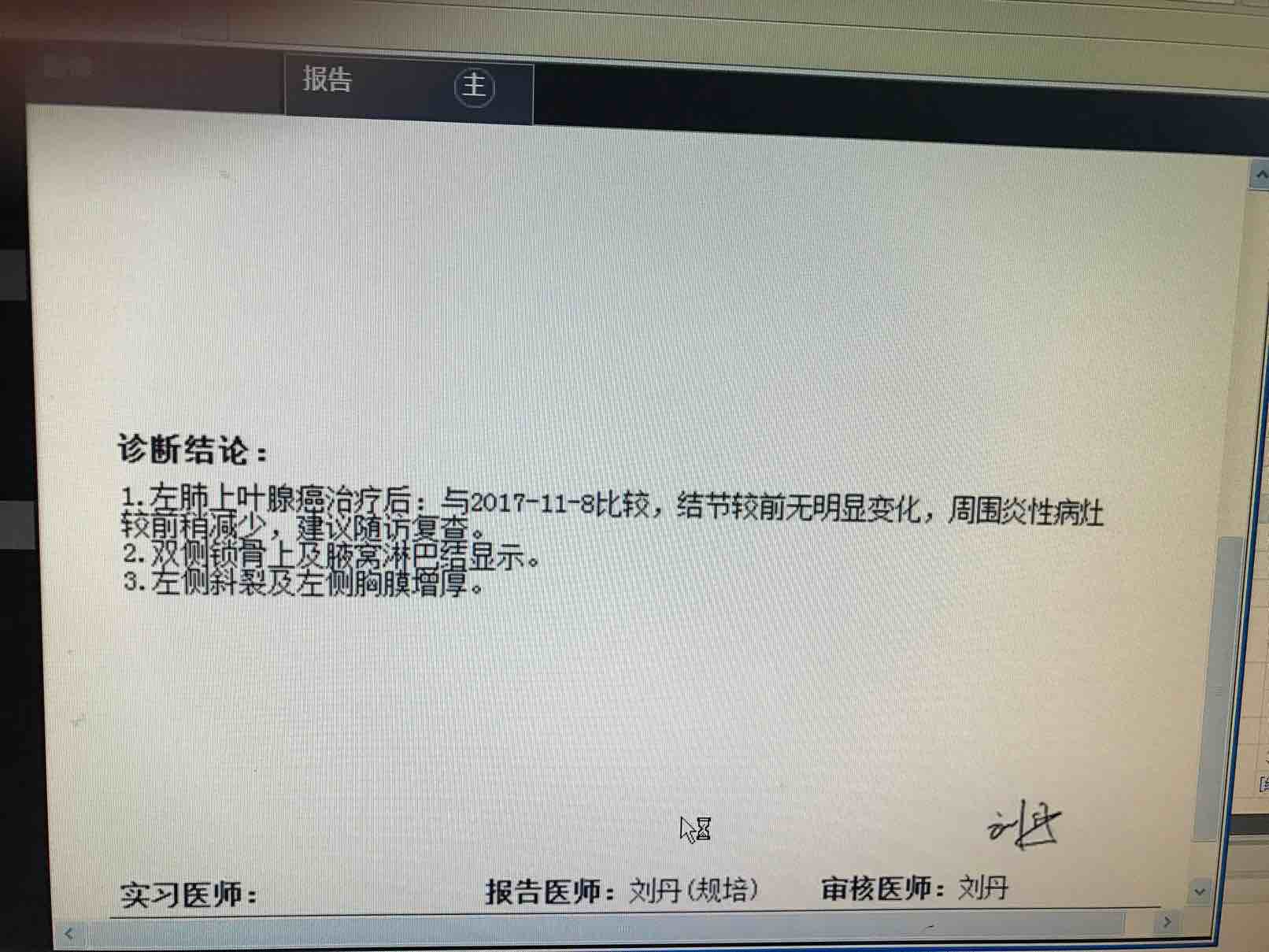 9.18确诊,9.22开始吃克唑替尼,前面每次复查都在缩小,可是这次居然发现锁骨和腋窝有淋巴结,是规培医师看错了吗,还是我这就耐药了呀?目前体感还是很不错,就是有点晕,因为11月中脑转单发,做了伽马刀。