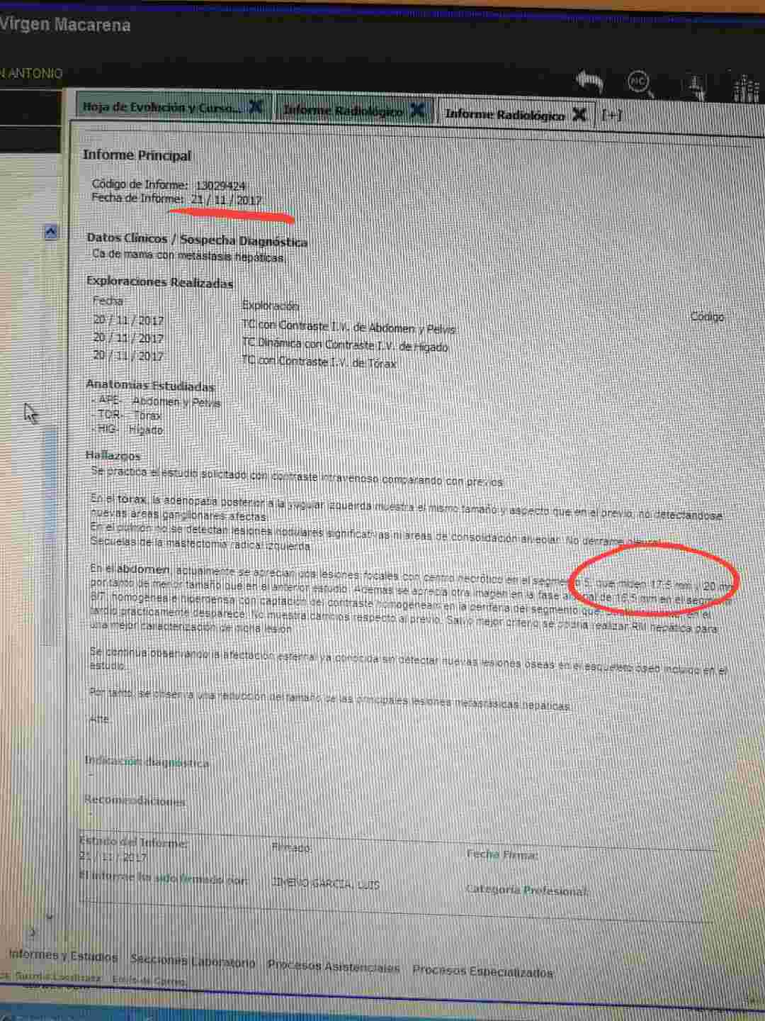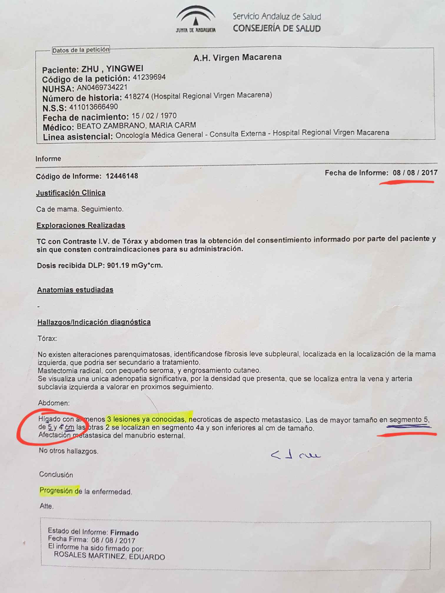 5月份到8月份我接受了化疗,再次检查的时候发现肿瘤还在长,并没得到控制比原来还大了一点,医生就让我改吃阿帕替尼,同时我还服用了肽,就这样吃了三个月,感觉?免疫力有所提高,精神胃口都比原来好很多,11月份在去复查的时候,意外的事情发生了,癌症不但控制住了而且指数居然还下降了一半多,当时医生都惊了,怎么可能这么短时间内下降那么多!从5cm降到17.5mm(1.75cm)还有个从4cm降到20mm(2cm)!!当时我们全家都开心坏了,感觉又重新找到希望了!!给你们看下我的检查报告!由于本人是名长期定居在西班牙的华侨,所以字体是西班牙语的 我把指数以及日期标起来你们看下!相信只要保持好的心态以及继续服用肽并配合医生治疗,肯定能战胜病魔!大家一起加油!