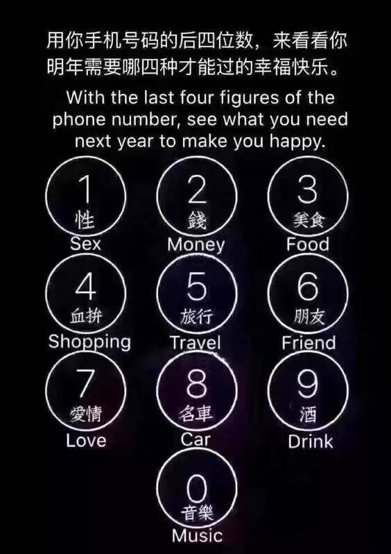 来来来,娱乐一下!用你手机号码的后四位数,来看看你明年需要哪四种才能过的幸福快乐!