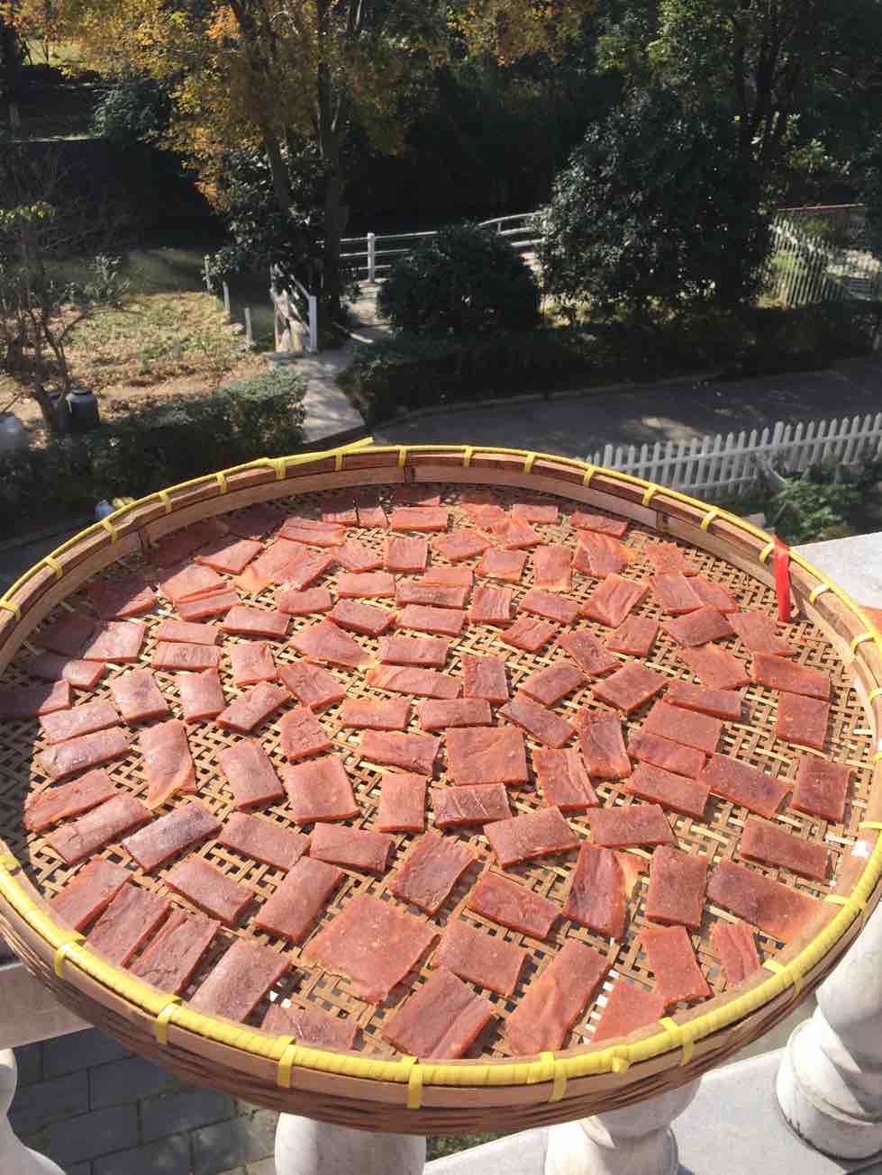 3、注意事项。(1)配方红枣必加,山楂光消不䃼,为了䃼脾胃必须加,茯苓有抗肿瘤作用,建议加,但加多了口感差一些。(2)放不锈钢盆怕粘,可在盆上涂油。另外建议用烘焙油纸,这个效果很好。(3)晒至半干时必须划成一片片,否则裂的一塌糊涂。(4)短时间内吃可以放常温放置,长时间吃放冰箱冷藏。