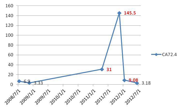为了鼓励更多的患者正确面对这种情况,我们再多举两个例子,一例术后病灶侵达肌层,周围淋巴结(1/15)可见癌转移,患者术前CA72-4即有升高18(U/ml),在术后三个月、一年复查时CA72-4仍呈现不同程度升高,最高达130(U/ml),之后逐渐降至正常。此后,CA72-4仍多次出现波动,但影像学检查始终没有可疑发现,目前患者仍健康生存,已接近术后五年。