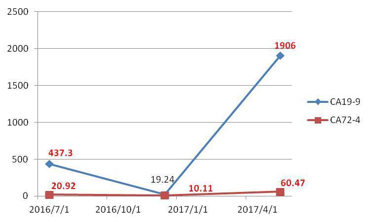 从这例患者我们看到如果患者术前伴有多项肿瘤标志物明显升高(数倍以上),往往预示着肿瘤术后容易出现复发、转移,提示预后不良,因此对于这类患者,术后肿瘤标志物如果再次升高一定要引起高度重视,通常是肿瘤复发的先兆。