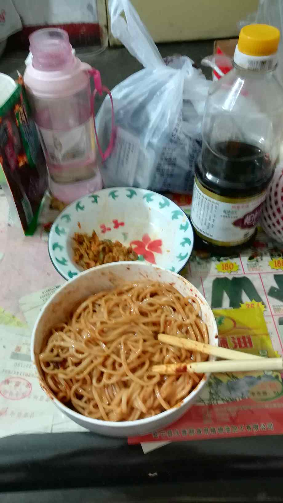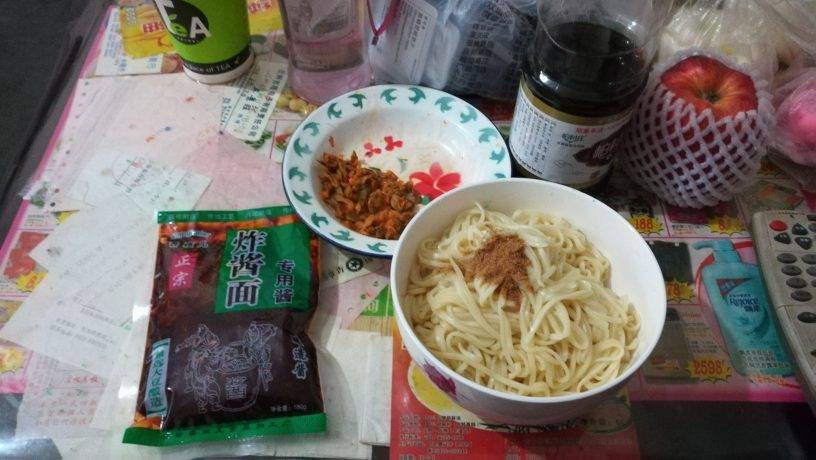 爸爸去姑姑家了,一个人吃饭。买了包炸酱调料,除了咸就是咸,没吃完