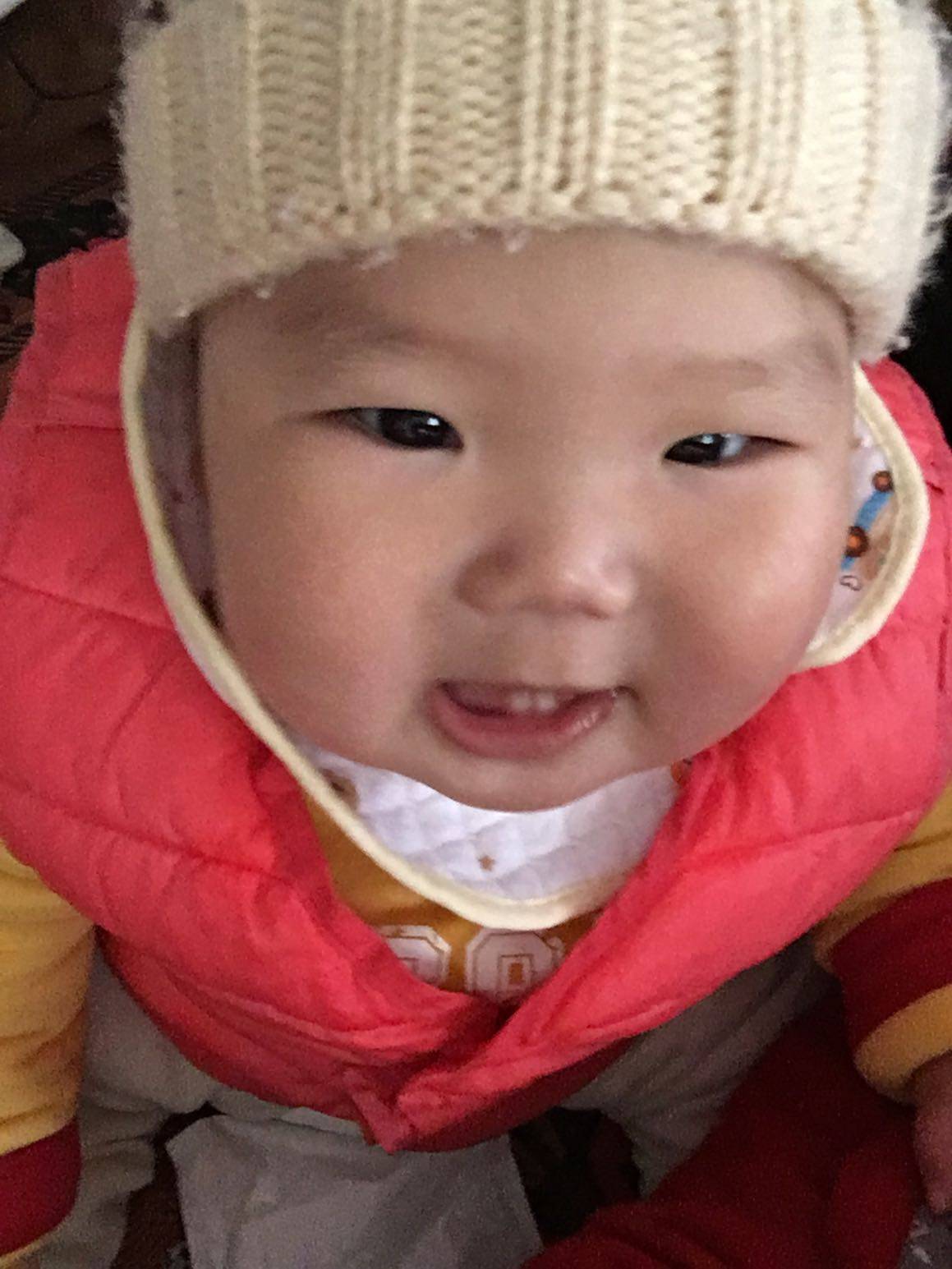 长了两颗牙,上边的两颗也快冒出来了,还是胖胖的,天一冷穿的跟个球一样