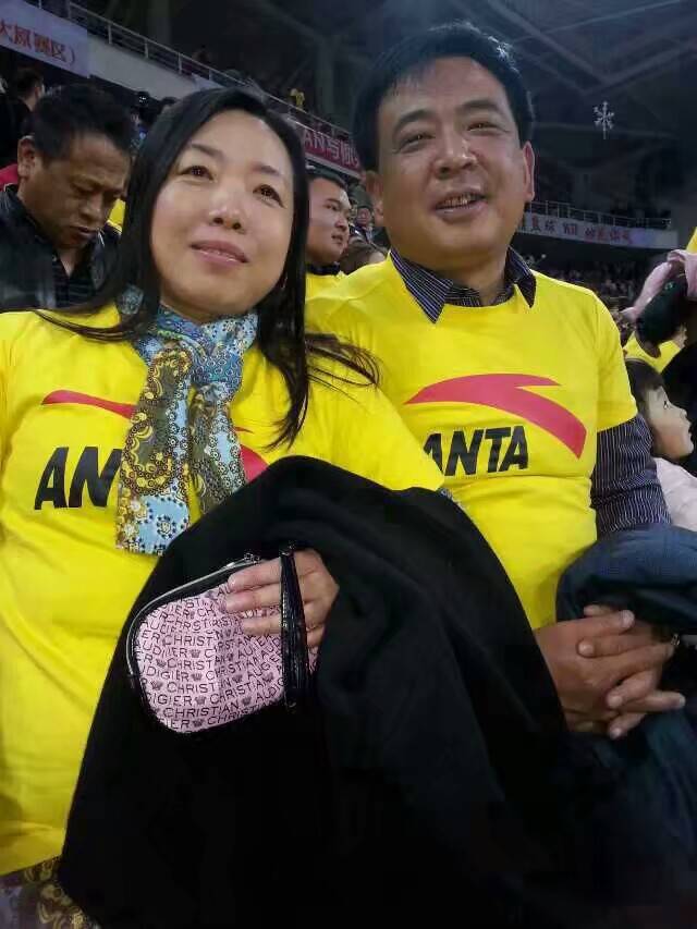 (照片二):我俩身穿球迷的服装,拍摄于女篮比赛的现场;