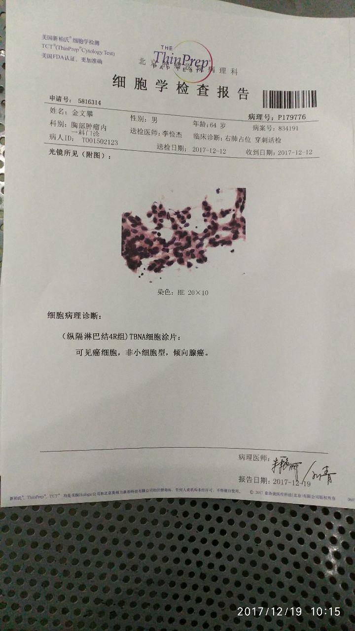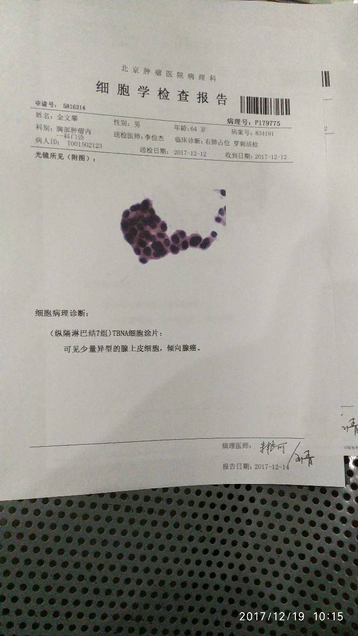 一个月,一个月才出来病理结果。第一次胸部穿刺组织无效。又等了一个星期预约的,支气管镜穿刺。又等了一个星期,今天才拿到了这个病理结果。真的不相信这一切都是真的。