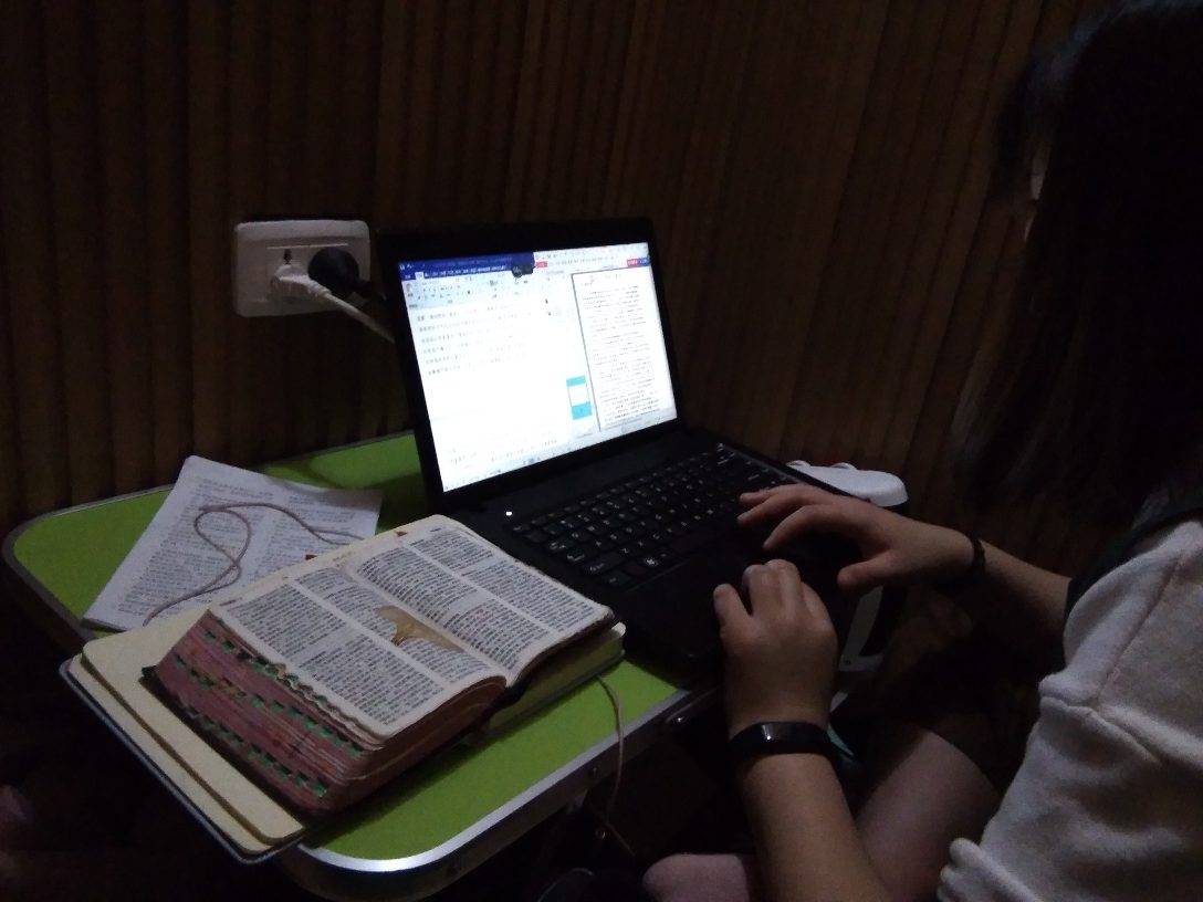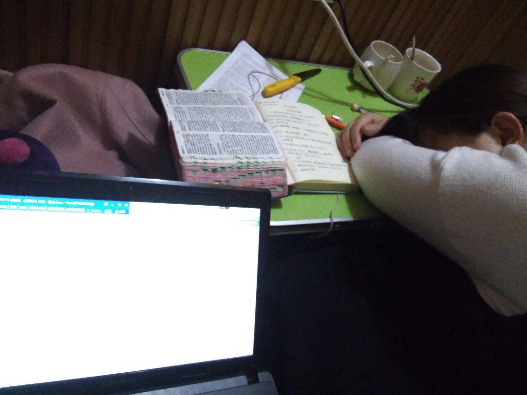晚自习过后,我们就去祷告洞开始奋战了,释经经文她找的,我给了她一个我自己的思路(当时已经11:00了🙄🙄,其实想回寝室睡觉),但我发觉她根本就是毫无头绪的,我又帮她熟读经文,找出重点,我叫她先把题目,大纲给弄出来,结果她根本不知道该怎么去弄,好吧,没办法,我又帮她想了题目,写了大纲(已经1:00了🙄🙄)到引言部分,她又卡壳了,我又帮她写了引言!到内容部分,需要释经,我叫她去释经书上看,觉得好的可以组织起来,写出来,她就去弄了,(我也一直没合眼,也在看释经资料),她写了一部分后,我看了一下,纯属摘抄,本来想要叫她重弄,但看到她很累,我就把电脑拿过来替她写了,她睡着了,而我在奋斗(此时已经2:30了)🙄🙄一直写,一直弄,弄到了3:30,觉得浑身无力,就眯了一会,到4:20醒了,又继续🙄🙄5:00的时候终于把第一大点完结,第二大点开头,就靠着睡了,到5:57一下子醒了,就去参加小组祷告了,还好醒了,不然就迟到了(迟到要刷碗),就这样,熬了一晚🙄🙄