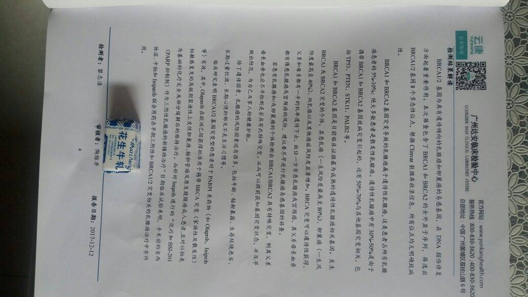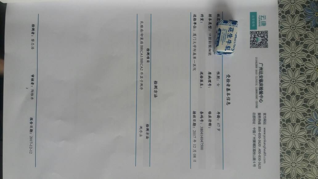 获此机会后,经过咨询和沟通,决定给爱人做这个检测,目的是对爱人的预后和复发风险做到“心中有数”,其实对BRCA1/2基因检测还比较陌生,不甚了解。