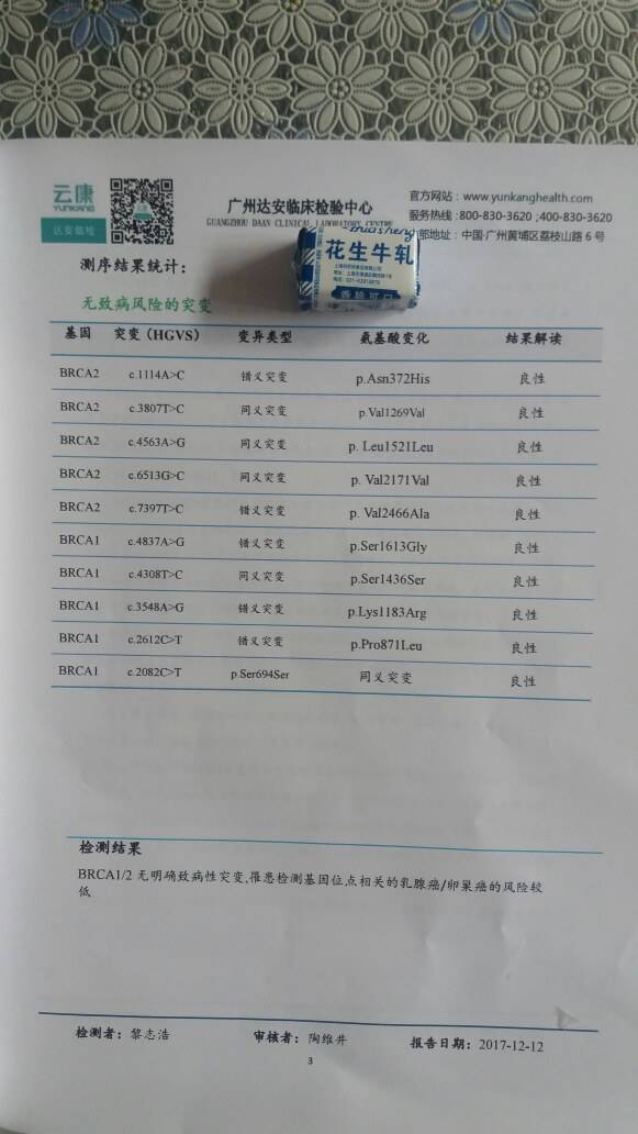 检测报对BRCA1和BRCA2的基因检测结果详细显说明,对基因突变情况进行分析和评估,虽然有些专业术语不很明白,但看结果还是较为让人“松一口气”的。