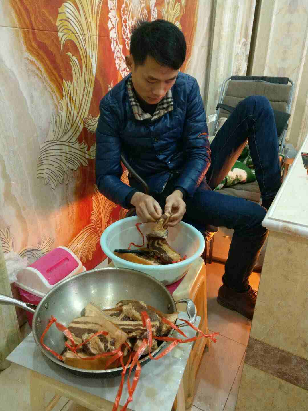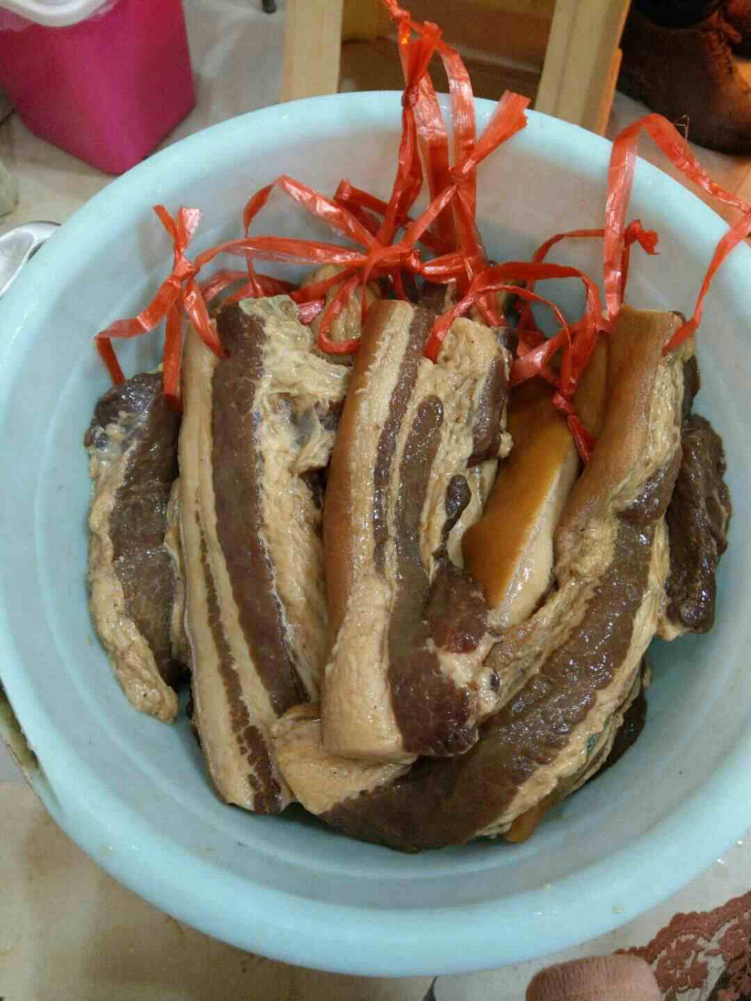 大哥在的时候和他买来做的,现在他走了几天了,刚好时间到(腌了6天)所以今天就拿出来洗干净凉了,上次大哥在是大哥帮忙,而这次是老公帮忙了!