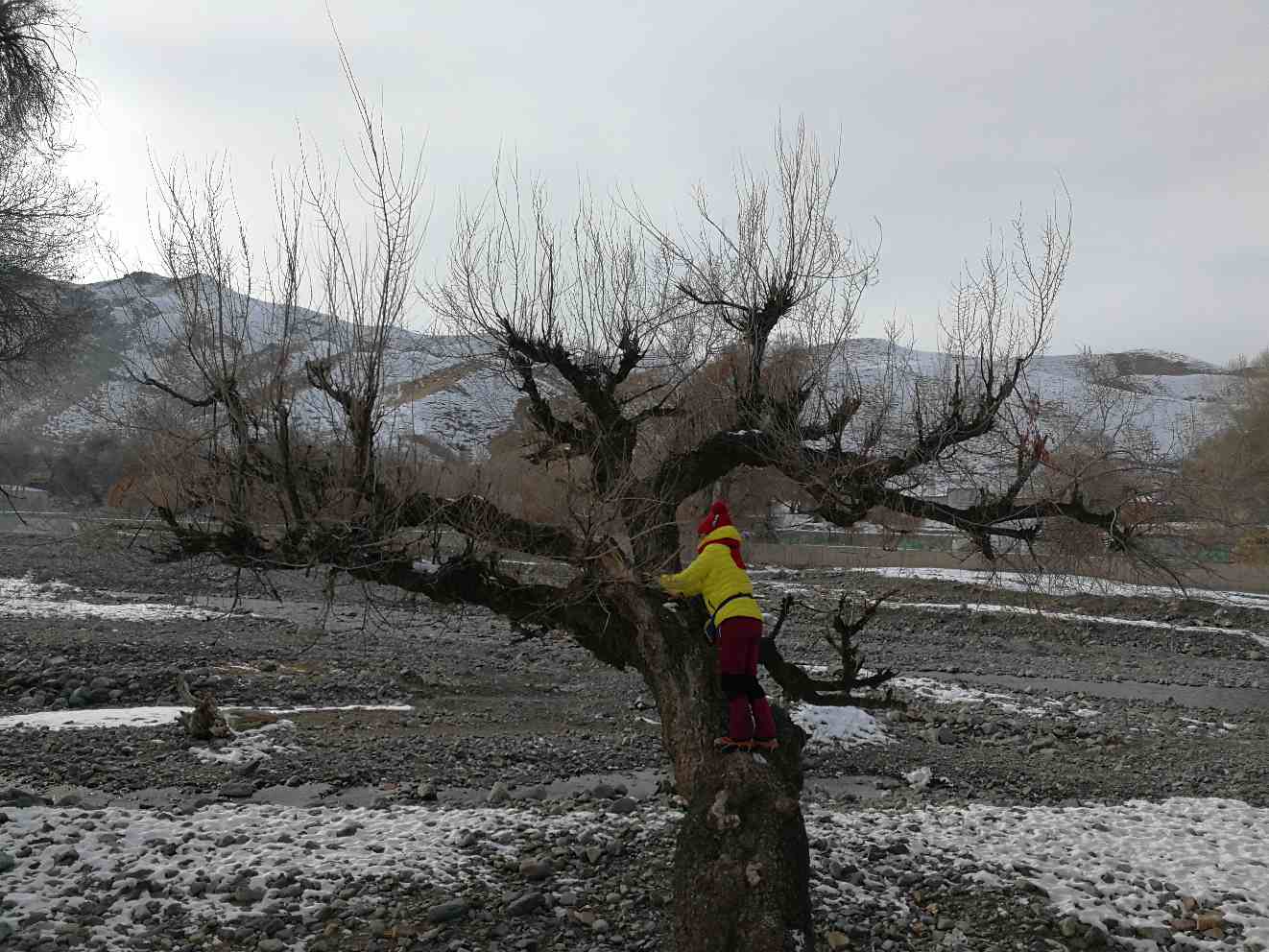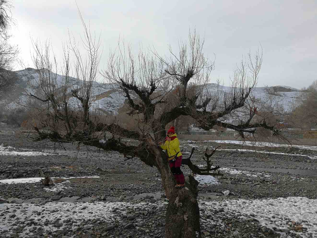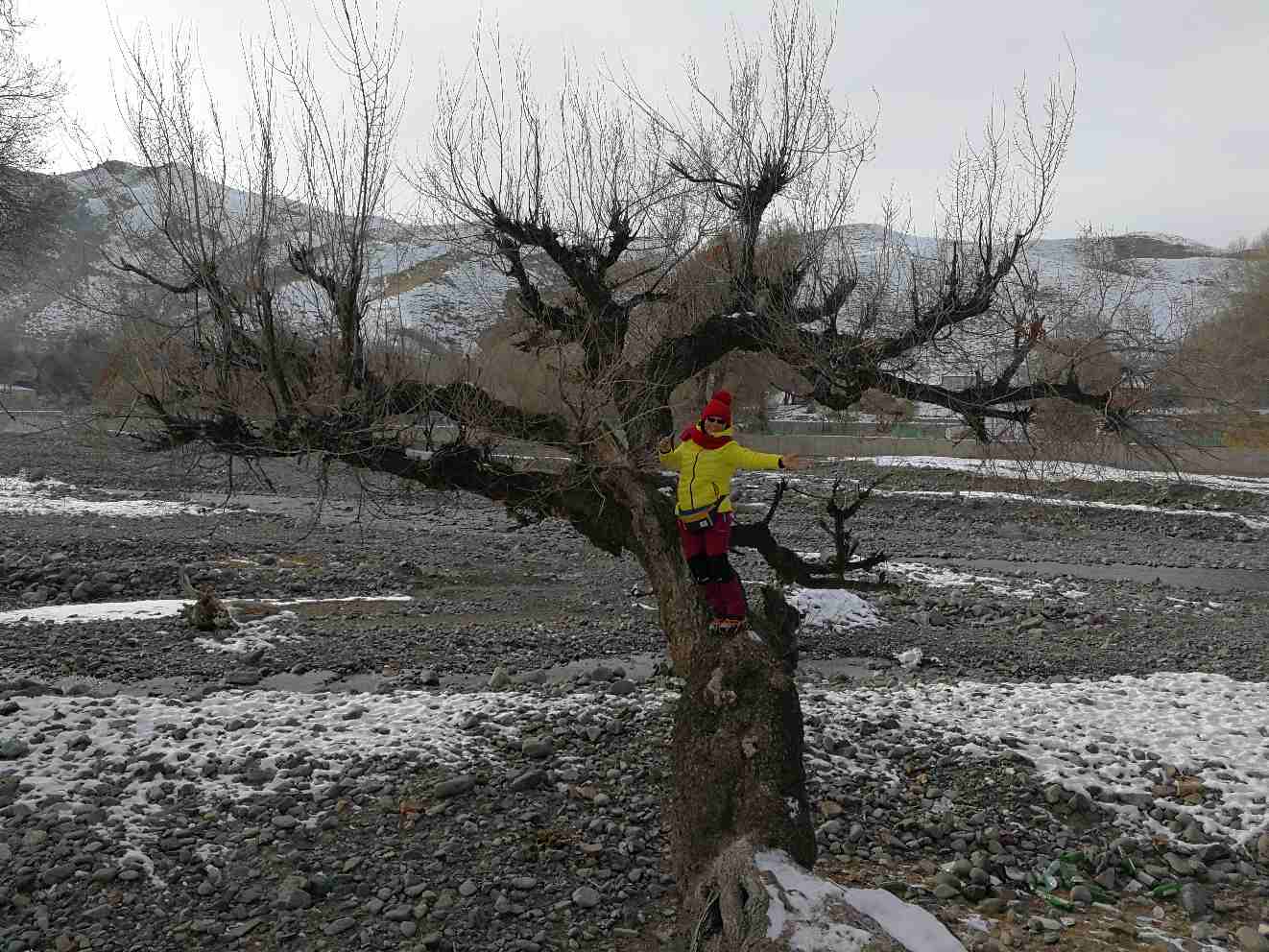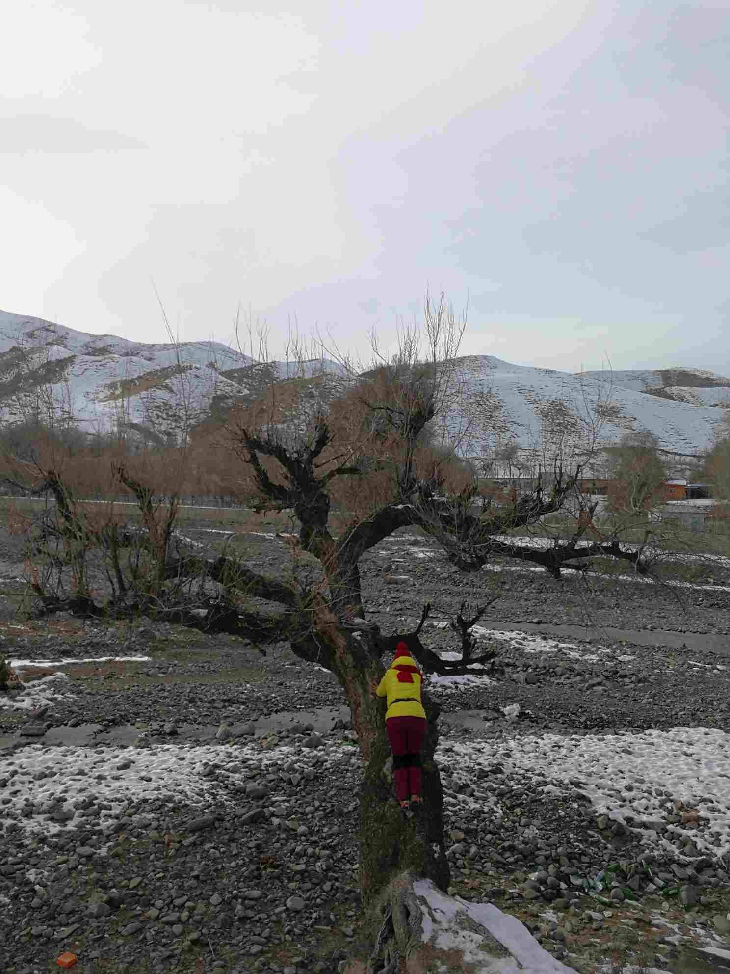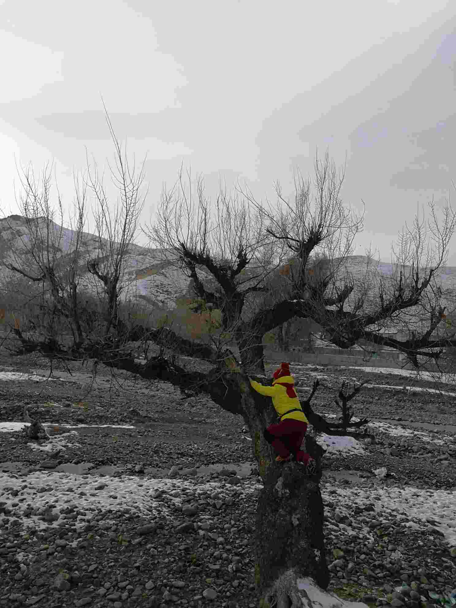 (2017年12月24日去独山子村小可可托海,徒步归来时看见时间还早,路边一棵孤独的树立在那儿,为了爬上这棵树费了好大的劲,最后还是被我征服,爬上去啦。其实去独山子村有N次了,每一次路过都没有想爬上去的冲动,可这一次我就想爬上去,不想错过能给我带来快乐的每一个瞬间,把所有能给我带来快乐的人、事、物都留在这,真正属于你的,永远不会错过,只是时间早晚而已!)