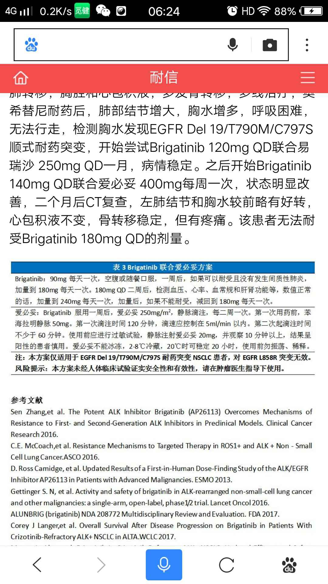 临床试验里纳入了42名EGFR突变NSCLC,只有2名患者肿瘤部分缓解,其中1名为EGFR Del 19/T790M,Brigatinib 120mg BID,第二个月就进展了;另1名为EGFR Del 19,Brigatinib 120mg QD。由于表1的体外肿瘤细胞株数据可知,Brigatinib 180mg每天一次时,血药浓度值低于抑制EGFR T790M突变肿瘤所需的IC90值(抑制90%肿瘤细胞生长时的药物浓度)。