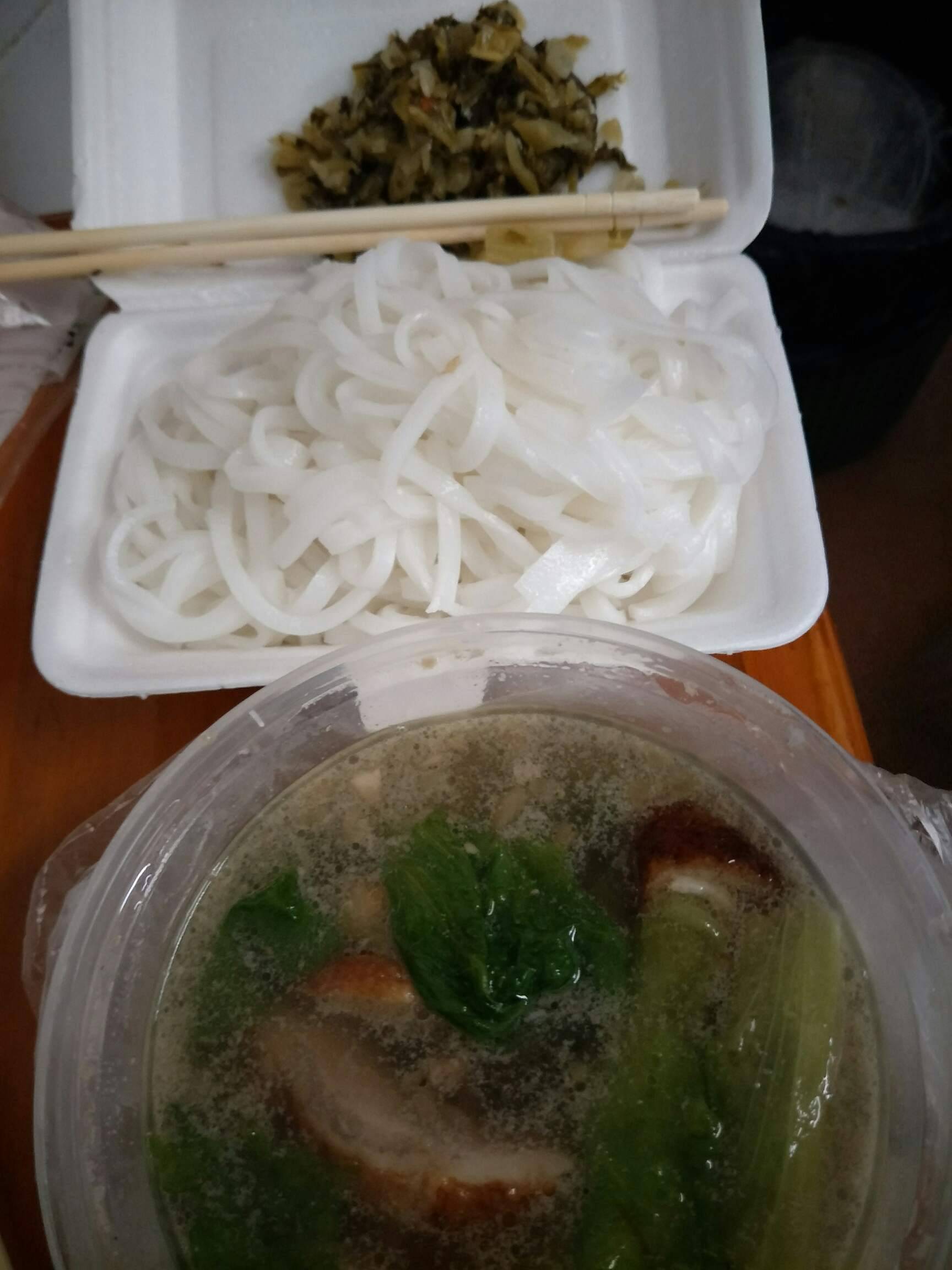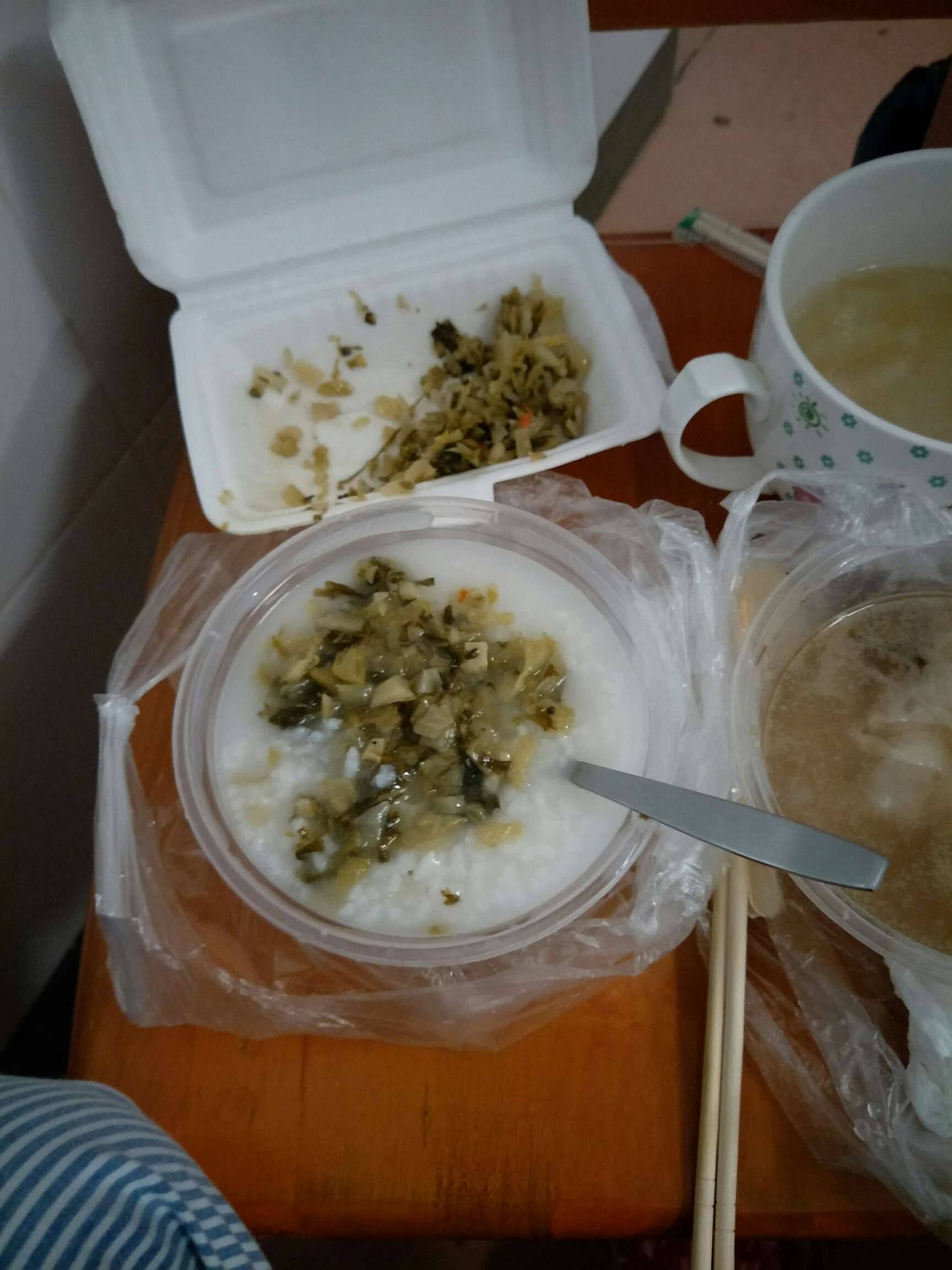 没有做饭,就叫了个白粥,一个汤粉,母女两吃,还加了两份酸菜下粥和粉!