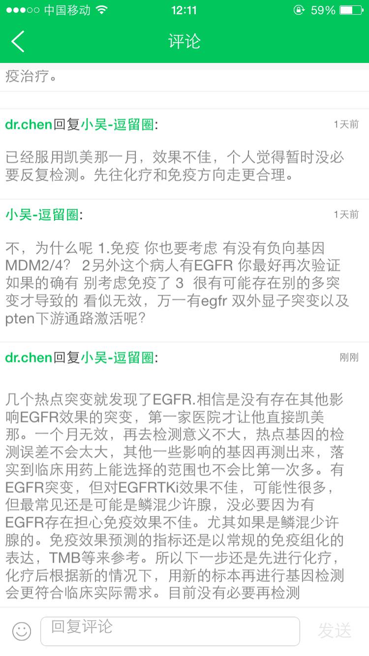 我们是一个月前在上海肺科医院做的病理,说是鳞癌,基因858突变。我在复旦大学附属肿瘤医院,挂了陈海泉的特需,想问问有没有什么更好的治疗方法,刚进门,告诉他鳞癌有基因突变,他就跟他学生说,你们看,肺科这样的专科医院也会犯这样的低级错误,鳞癌怎么可能有突变,然后他的一个学生就把我叫到一边,说这样,你先去肺科把蜡块什么的借出来,到我们医院再做一次病理,而且你们吃凯美纳,效果没有特罗凯好,298的挂号费,就因为这个分型问题就打发出来了。我赶紧去肺科借病理,肿瘤医生说要20还是多少片,我去肺科,他们说只有4片了,我问4片能做出来吗,他们做不出来的,交涉的过程中,觉得他们有所隐瞒的感觉,最后我还是借出来了,但是到肿瘤医院病理人家不收了,我又挂了个肿瘤科的号,问医生,那个医生说你别折腾了,如果在他们医院重做穿刺,要一个月左右才能做到,不如先吃凯美纳,一个月复查看效果,我想也是,就回去了。今天一个月时间到了,来肺科复查ct,结果没啥变化,病人疼痛依旧。医生说可能凯美纳没效果,今天办住院手续,下周二入院,唉不知道是不是一开始就是错的,现在比较迷茫……